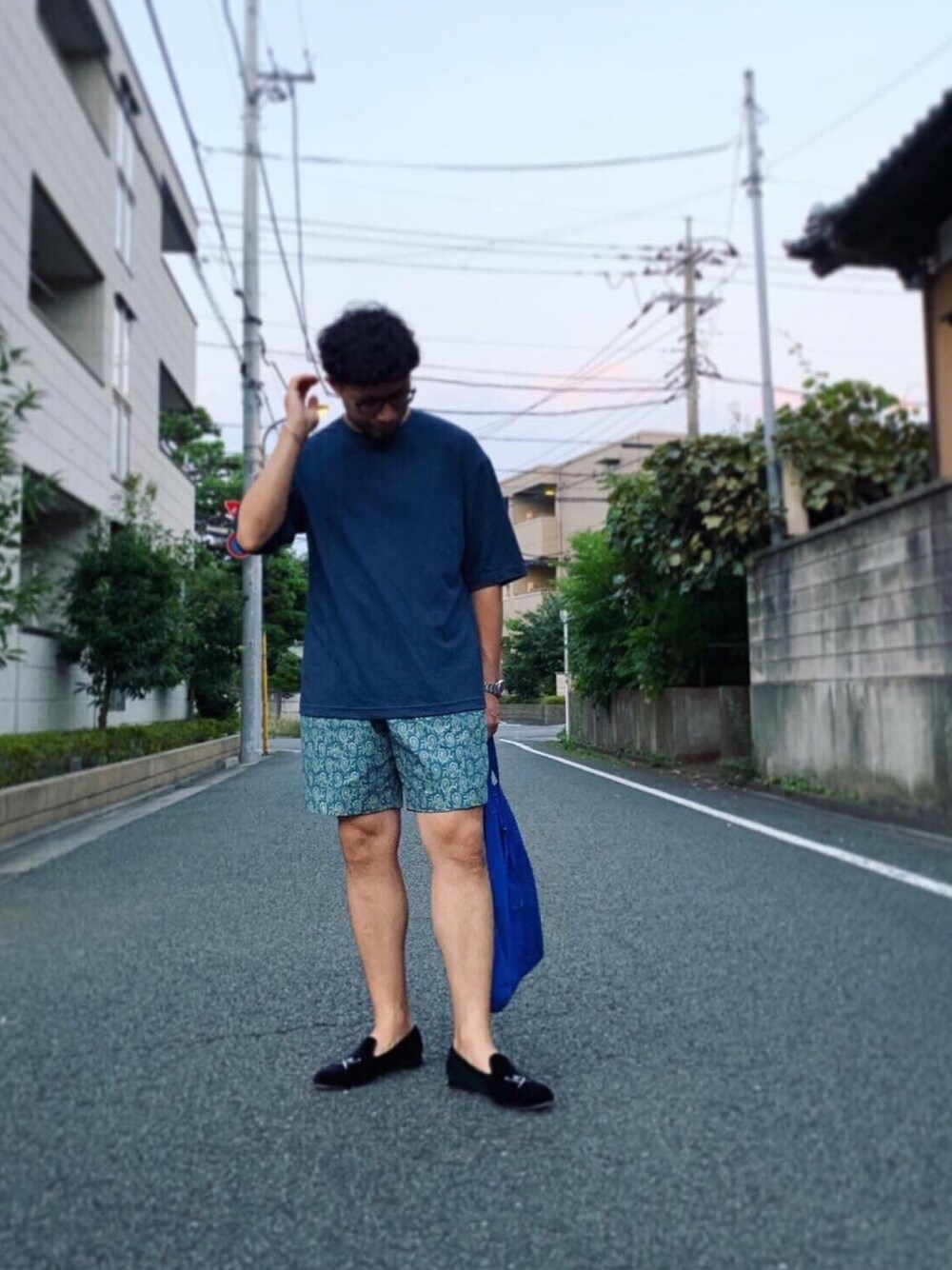 柄ショーツのカジュアルコーデ。 淡い色合いの柄パンツは、同系色で濃い色のトップスを合わせると上品にまとまりそうです。 【きれい目ポイント】 ▪️さわやかな色をベースに色数少なくグラデーション ▪️Tシャツの光沢感 ▪️ベロアのスリッポン 【スタイルアップポイント】 ▪️ビッグTとひざ上ショーツでYライン ▪️オペラシューズ足元を見せて脚の面積を増やす