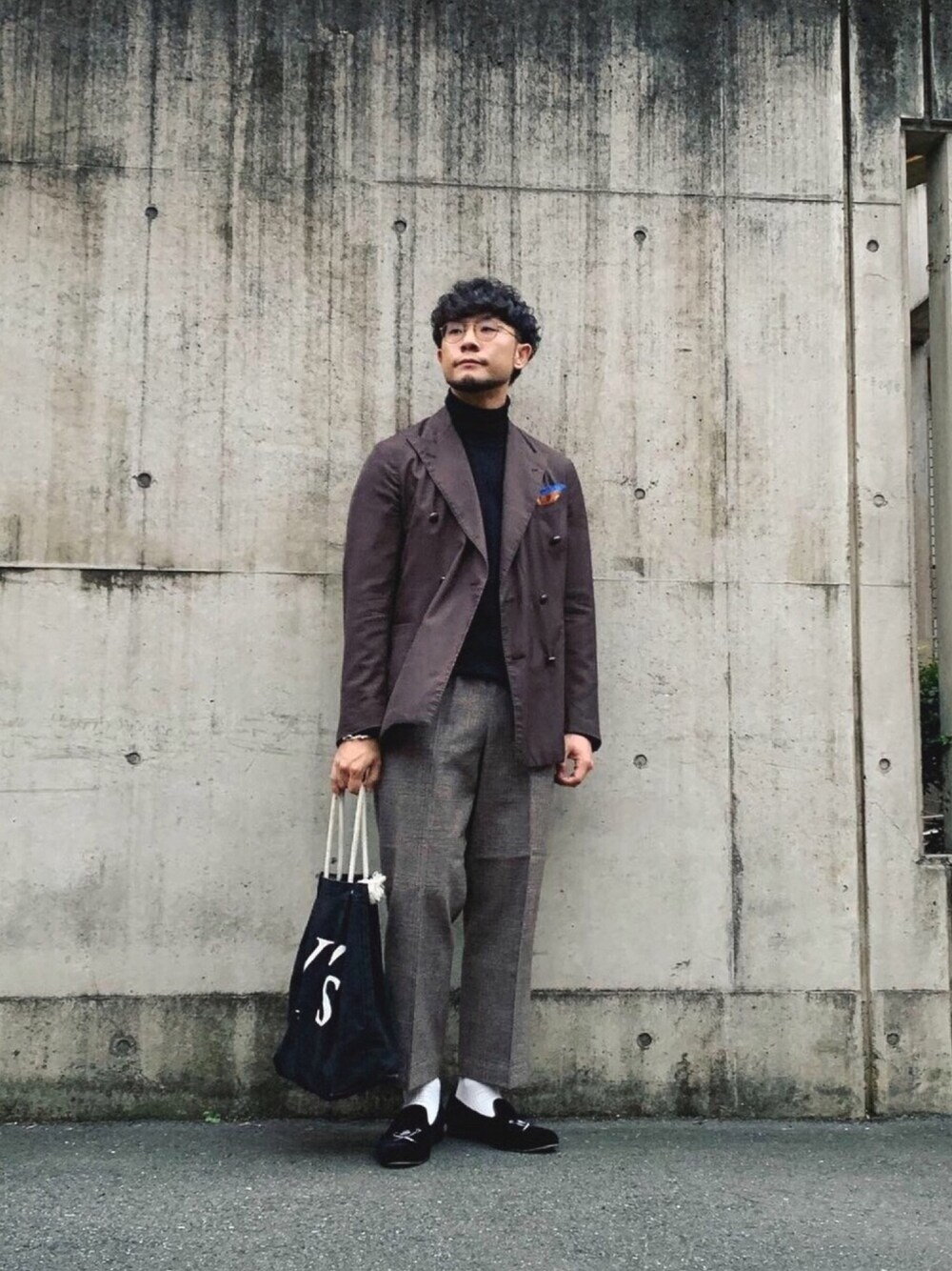ちょっと良いレストランに行った時の、ブラウン×ブラックのかっちりコーデです。 上半身はタートルネックニットにダブルジャケットでフォーマルにして、8分丈チェックパンツとスリッポンで白ソックスを出し、巾着バックと共に失礼のない範囲でカジュアルダウンしました。 チェックパンツのオーバーペンを拾って縁が水色のチーフにしたのですが、写真では見えませんね。。笑