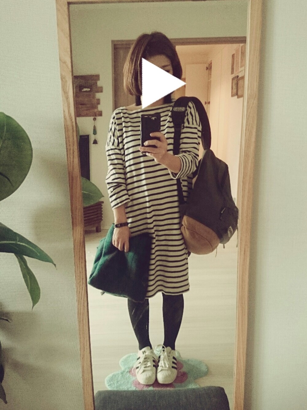 子どもの発表会。 ワンピースとリブタイツにスニーカー。 子供っぽくなりがちなので小物含めモノトーンで。 末っ子を抱っこしなきゃなのでリュック。 ボーダーにスーパースター合わせるの好き♡