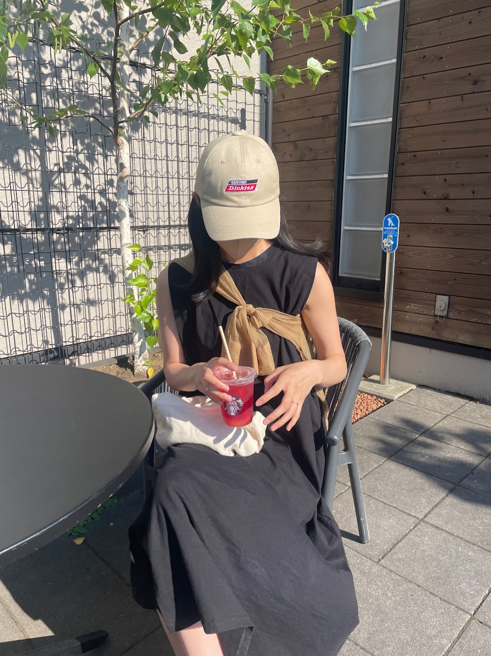 カジュアル大人っぽコーデ🌿 シンプルなワンピなので キャップとシアーシャツでワンポイント!!