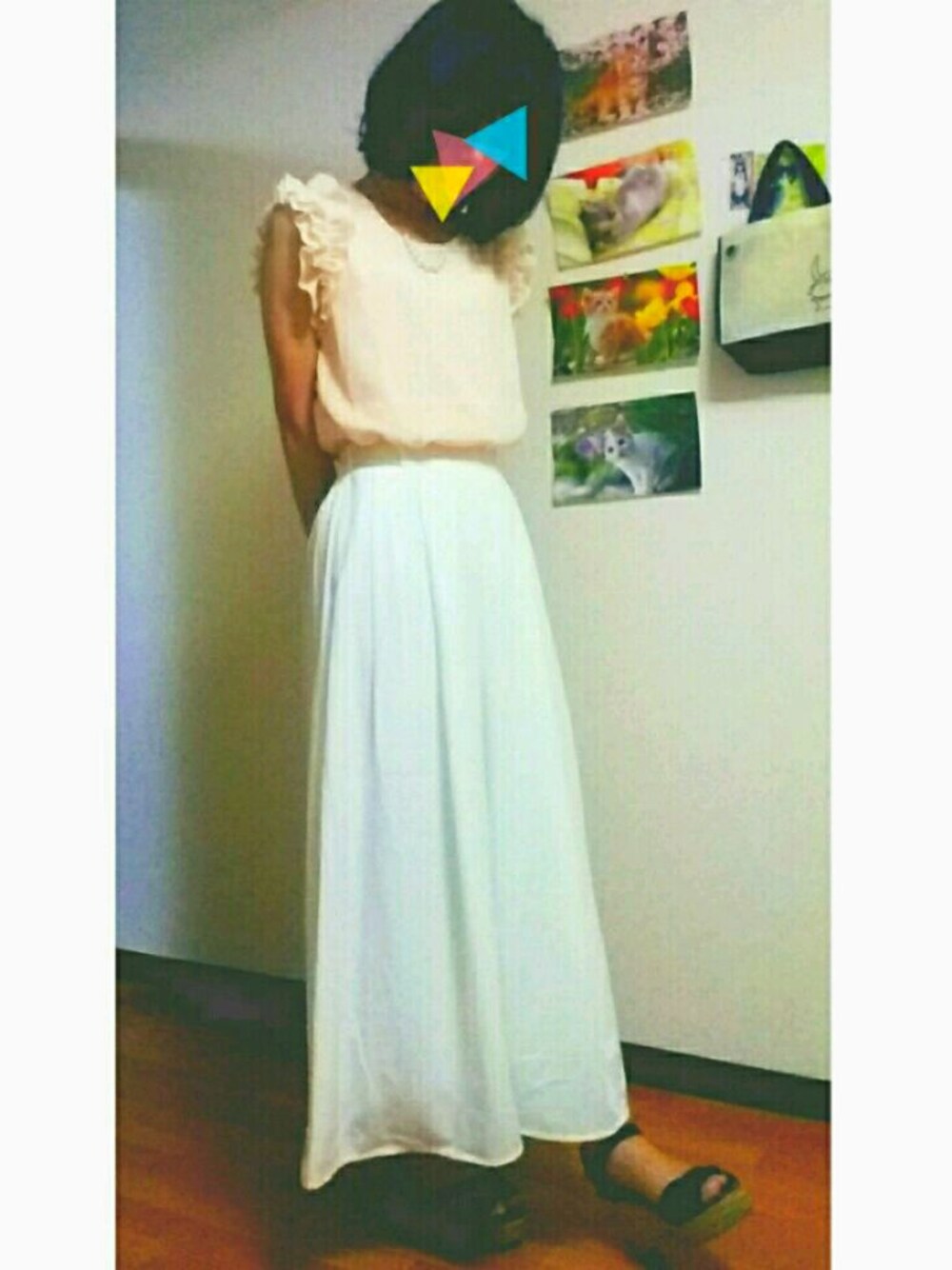 甘いコーデ 久々にピンク着ました💗 ピンク大好きだけど、 私はピンク顔じゃないから (つまり、可愛くないから) ここ数年はピンクの服は買ってなかったなぁ〜 でも、この肩フリルが可愛くて 久々に甘い感じのコーデでるんるん♪ (背景の猫達は気にしないで…笑)