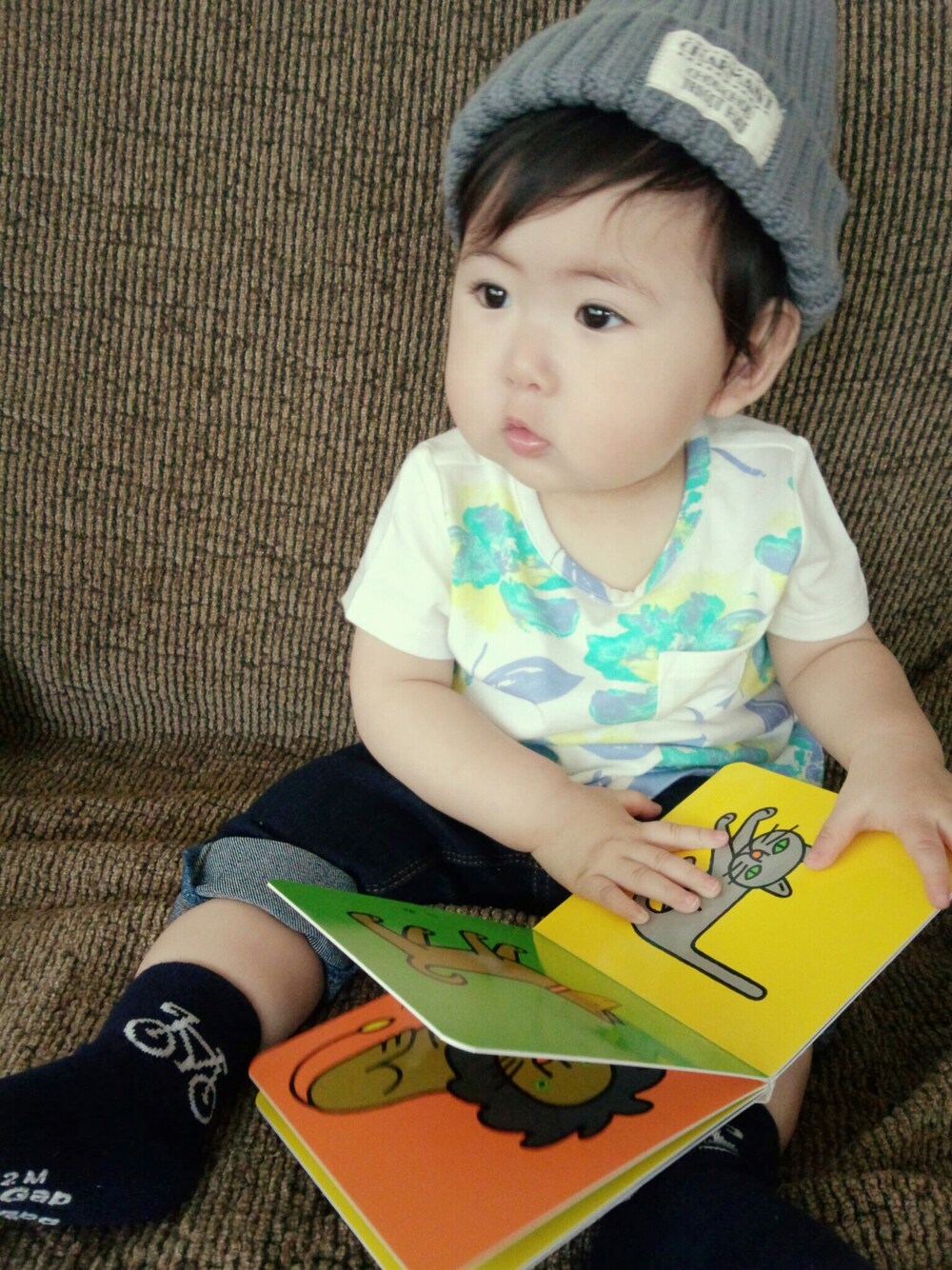 今日もボーイズライクな母さんのせいで… 男の子みたいですが、女の子です(^_^;) トップスは父さんが選んだGAPのTシャツ♡ 父さんは、花柄とか好きらしい…笑 母さんより女子力あるかも…w じじばばに買ってもらった、こぐまちゃんの絵本がお気に入りのご様子♬♩ 昨日で、娘は11ヶ月になりました☆ あと1ヶ月で1歳…はっやーぁ!!驚