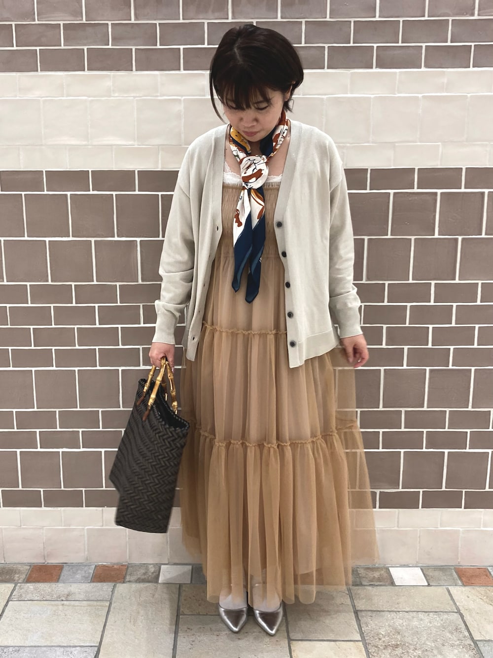 ご覧いただきありがとうございます😊 チュール+キャミワンピースに今回はカーディガンを羽織ってみました🎵 丈感も絶妙でシンプルなデザインなのでお仕事にもオススメです。 また昨年、大人気だったバンブートートバッグがカラーが変わって入荷しました✨✨ バッグやシューズなど小物類も新作続々と入荷しております。