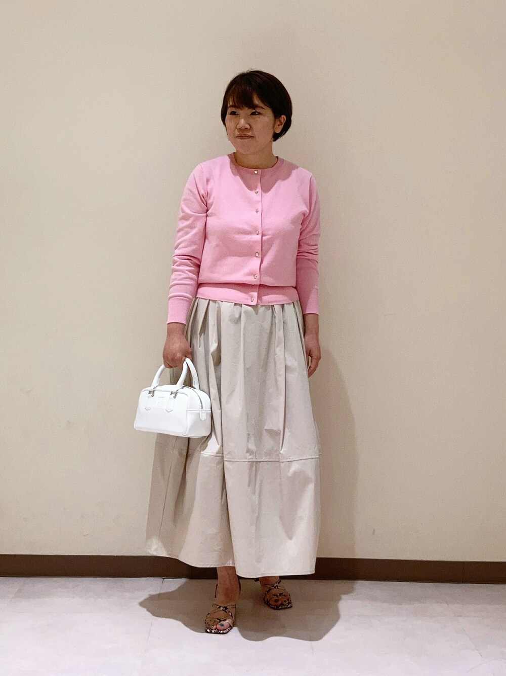 ご覧いただきありがとうございました😊 ピンクのカーディガンは、サッと羽織るのに便利です! 金釦が上品な印象に✨ コクーンシルエットが可愛いスカートは、意外にもボリューム感控えめです☝️