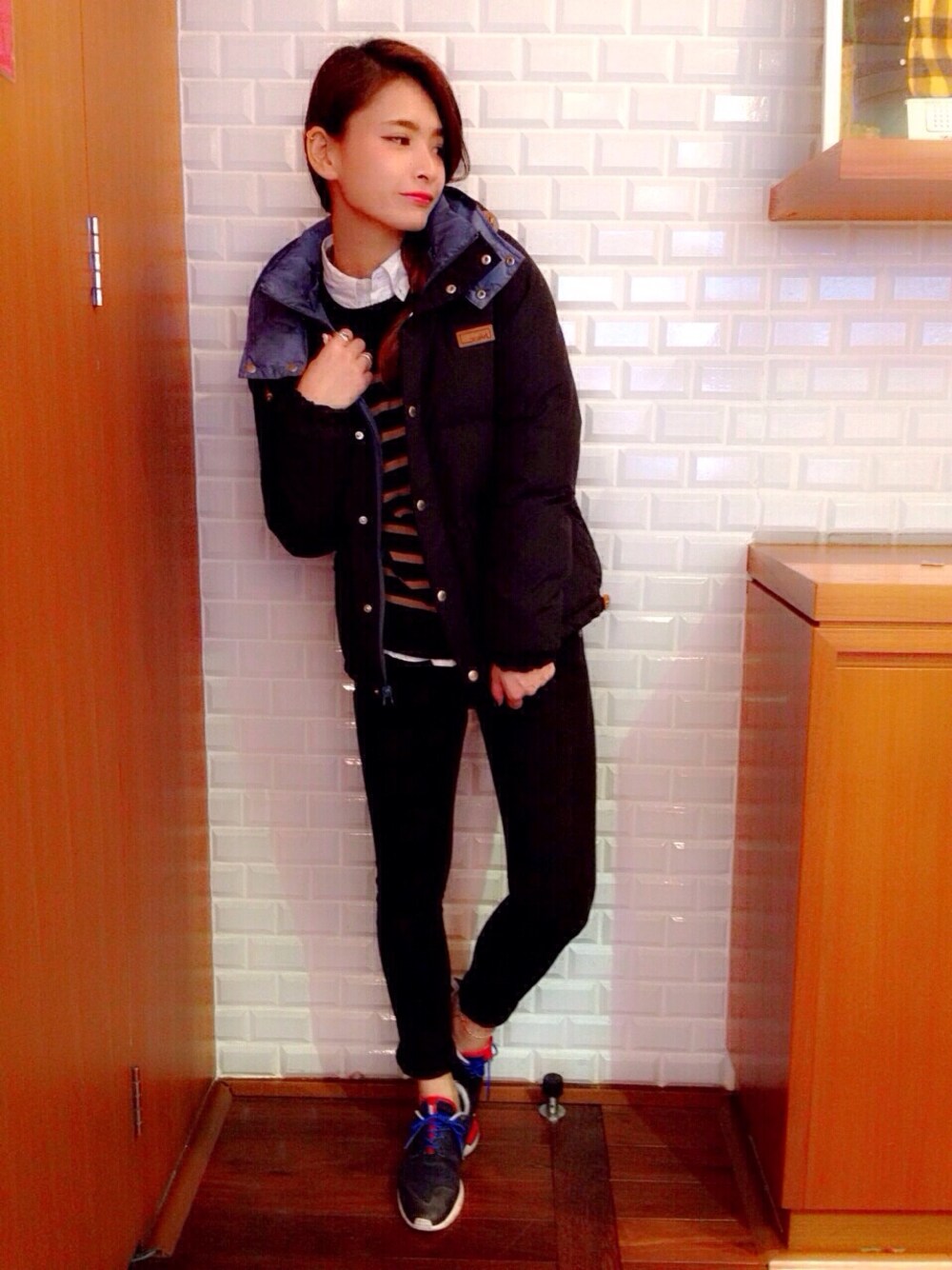 かっちりシャツstyleにパフジャンパーとスニーカーではずしを効かせる♡