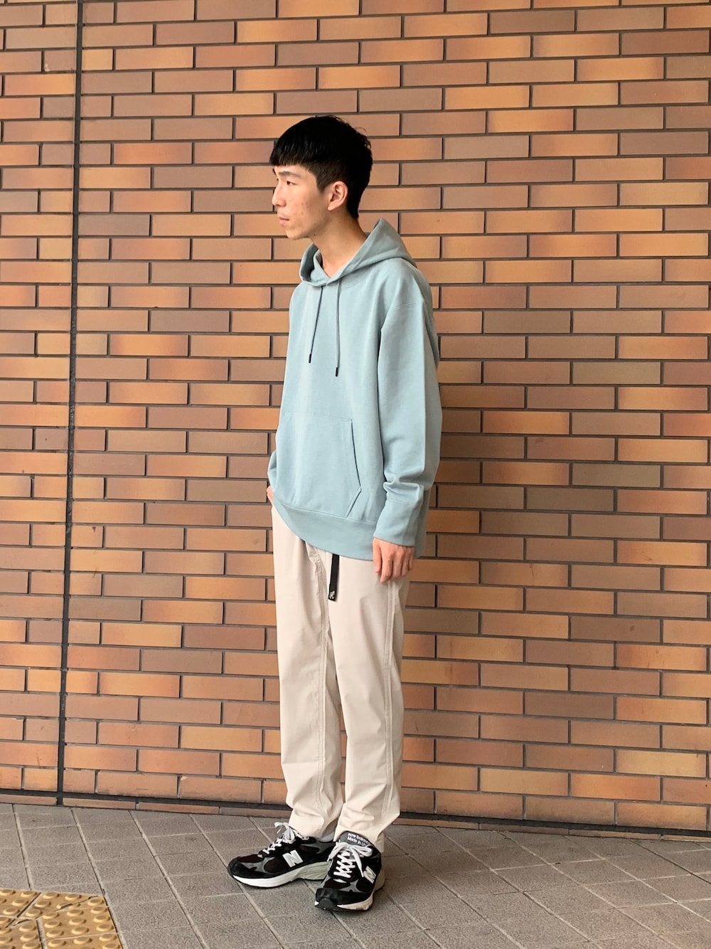 鮮やかミントグリーンのパーカーに、 ホワイトのグラミチ。 フードの立ち方が綺麗で、 パーカーの野暮ったさがありません。 1枚でももちろん、 冬はインナーに是非。