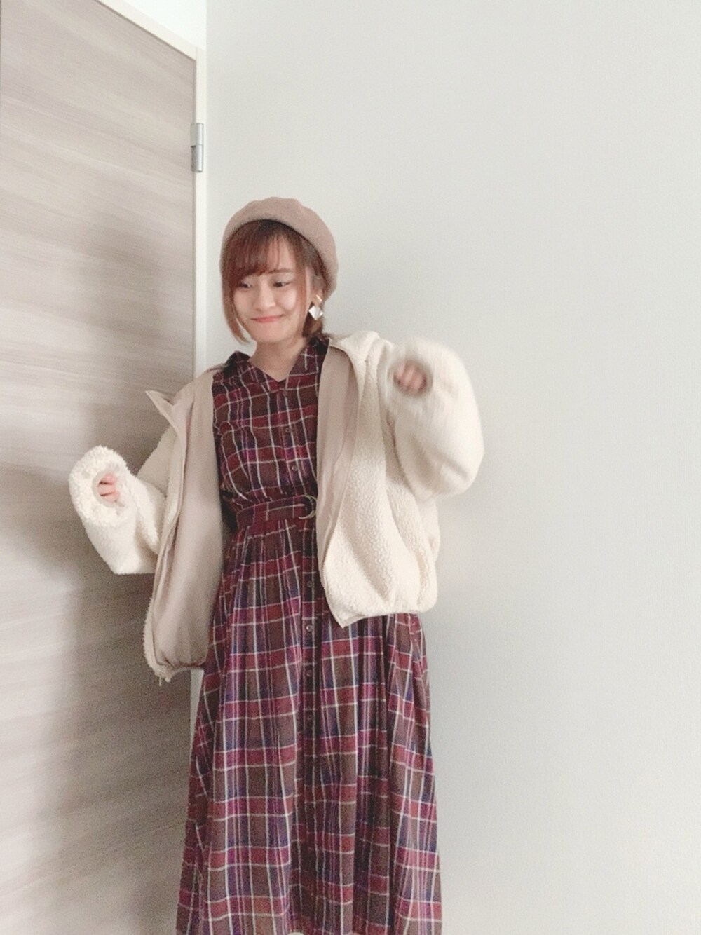赤チェックワンピースと もこもこの組み合わせです( ˙-˙ ) ベージュ×赤でまとめました
