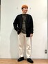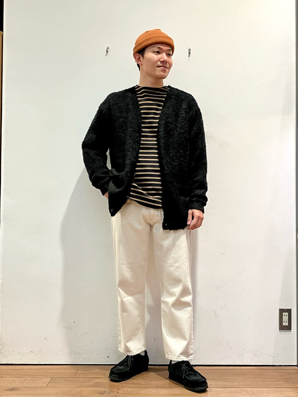 オレンジのニット帽を差し色に、起毛感のあるカーディガンを着用して大人カジュアルスタイルにまとめました!
