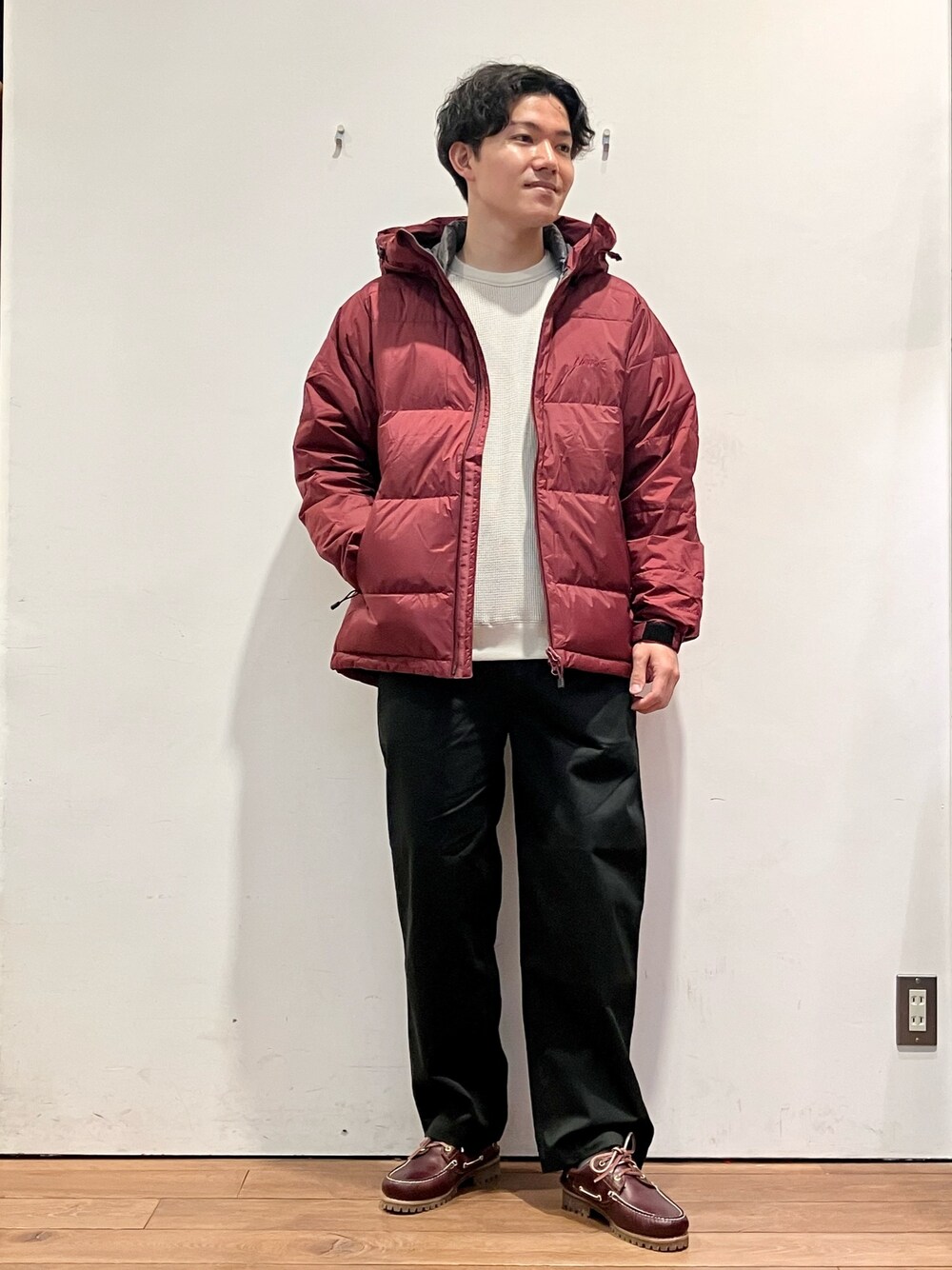 アウトドアらしいレッドのダウンジャケットを上品にまとめました! 着心地も軽く、透湿性にも優れているので、快適な着心地です!