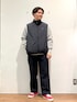 シンプルなネイビー×グレーのスタイリングに、レッドのスニーカーを合わせました! 中綿ベストは軽くて、温かく、中途半端な気温の際使いやすいです。 真冬はコートやブルゾンのインナーに。 トップスは裏地がフリース素材なので、温かく着用頂けます!
