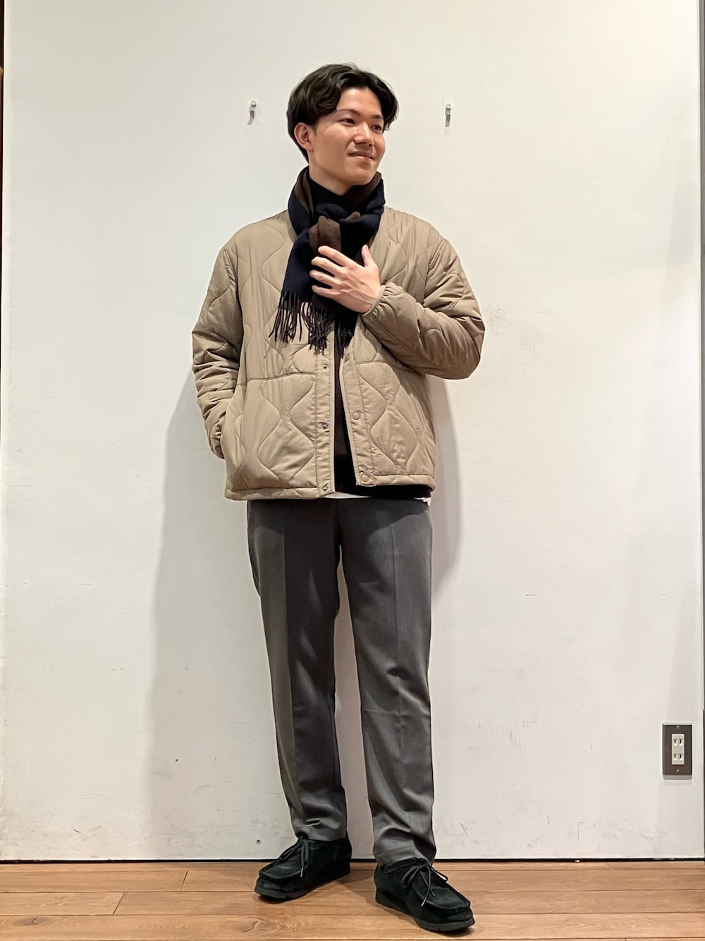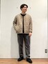 ブラウンアウター×ブラウンニットの秋冬スタイリング。 アウターは機能中綿を使用しており、軽さのある着心地ながら、保温性も抜群です。