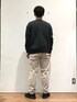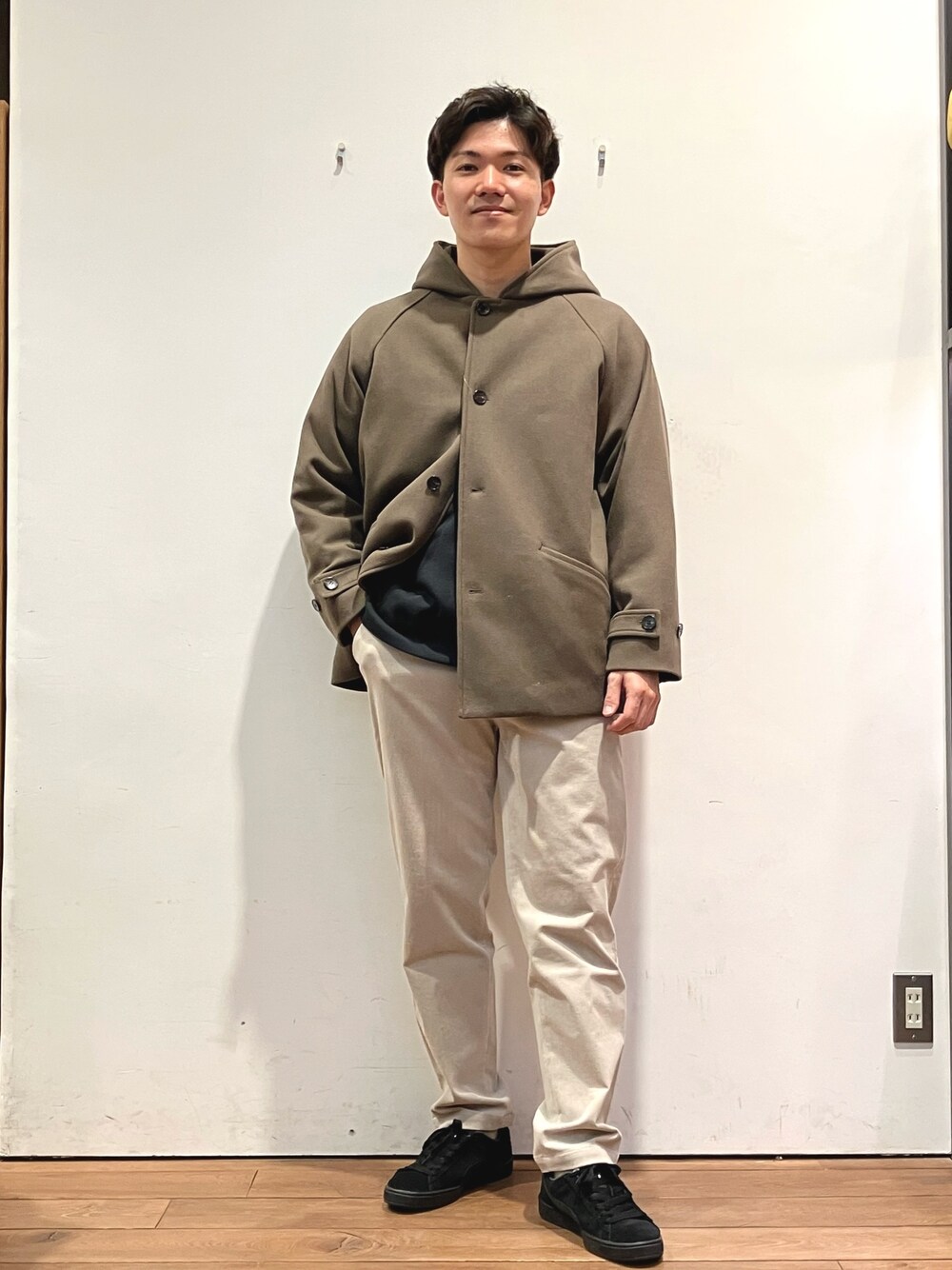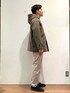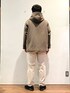 中綿入りのフードハーフコートを着用した大人カジュアルスタイリング。 ブラウンとベージュの色合わせでこなれ感のあるスタイルに。