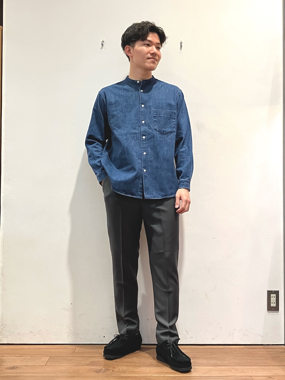 毎シーズン人気のデニムバンドカラーシャツをきれいめなスタイリングで合わせました! カジュアルなデニム素材ですが、バンドカラーシャツのデザインできれいめ且つこなれたスタイリングに。