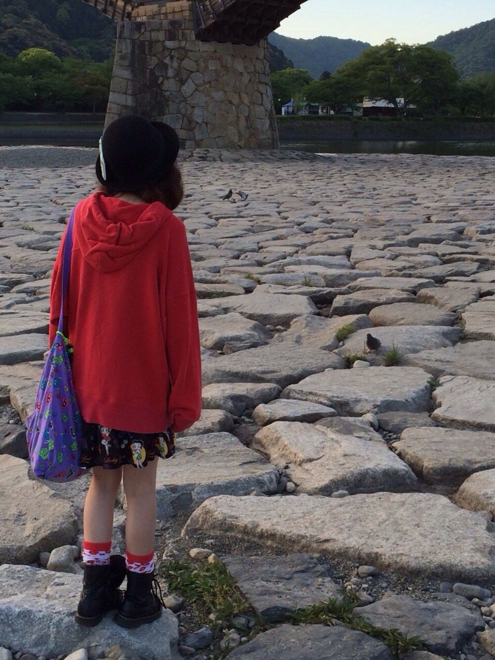 レッド系のパーカー、パープル系のトートバッグを着用したレディースの春コーディネートの1枚目の写真