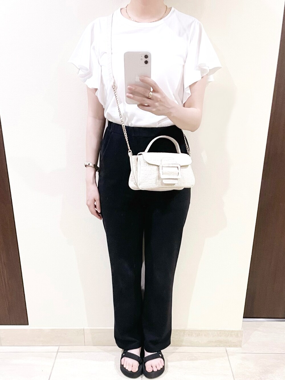 ブラック系のサンダルを着用したレディースの夏コーディネートの1枚目の写真