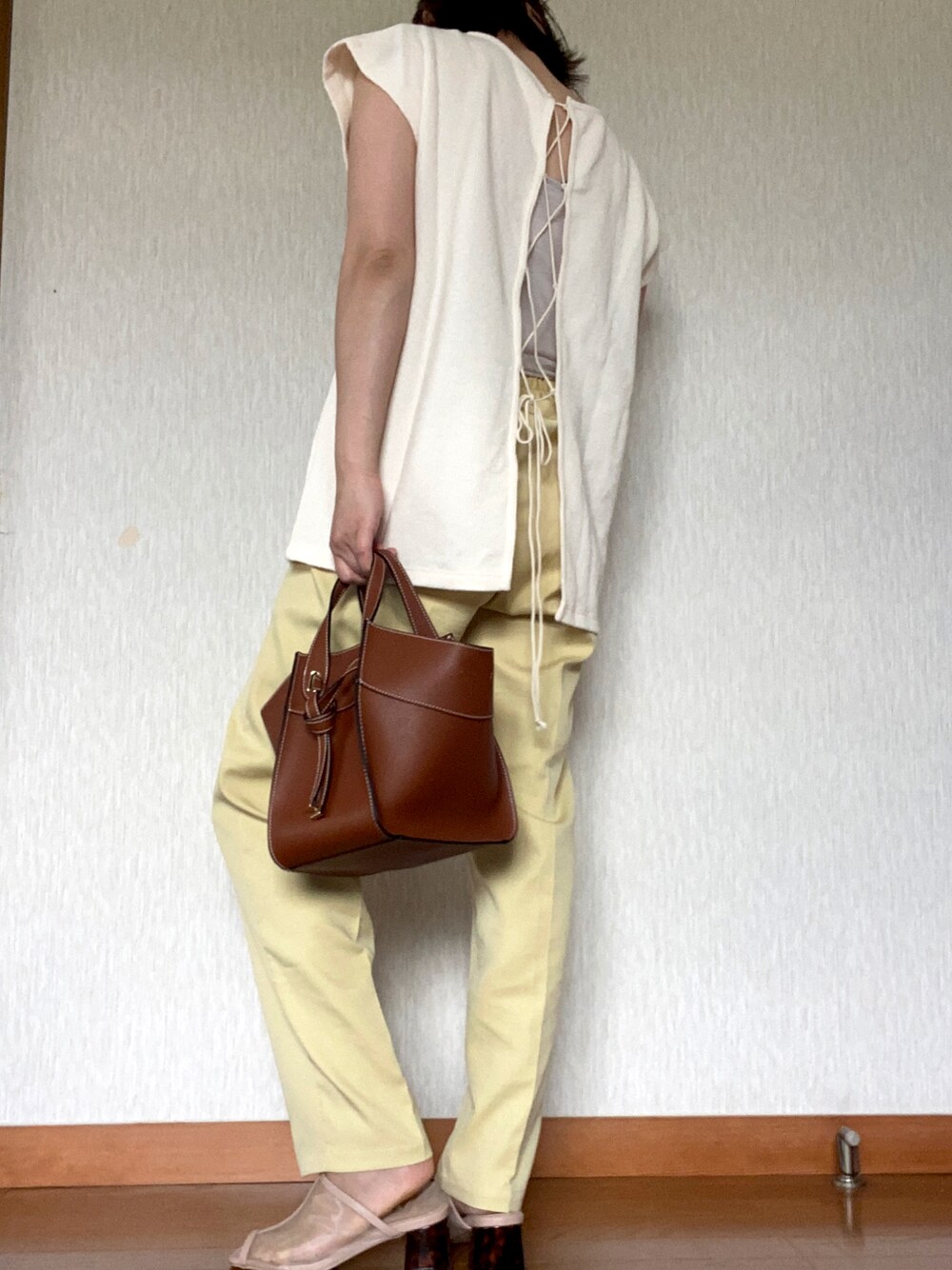 oyo.oyoのスラックス「【累計販売枚数14万枚突破!】センタープレススラックス カラーテーパードパンツ」を使ったコーディネート