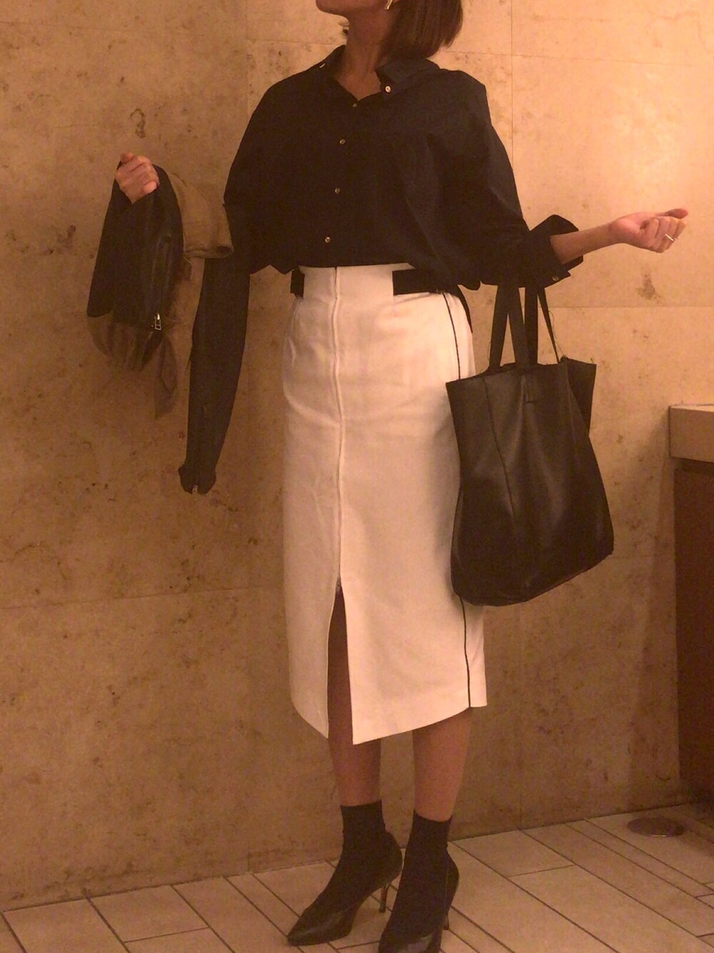 オフショルブラウスをオフィス仕様で/ LOKITHOスカートのスポーティ感を中和。でも金ボタンはしっくりこない(出てから気づく)/似合うトップス探そうっと。 /オフショルブラウスにアウターはおると襟ぐり変なことになる事件に耐えながらの通勤