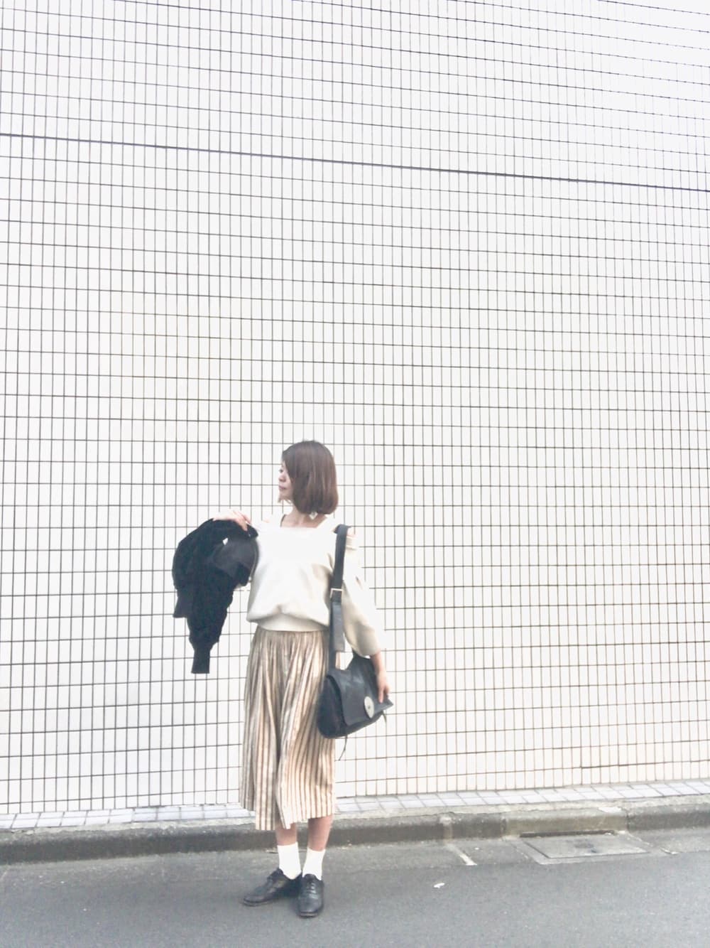 春/いよいよ本番/白と黒のツートン、素材とシルエットで遊んでみた/オフショルはまだ寒い/ピアスアウトレットで買った子、初出し。バッグとトーン合わせてみた。/スカート、もう少し長いほうがバランスよかったかなぁ
