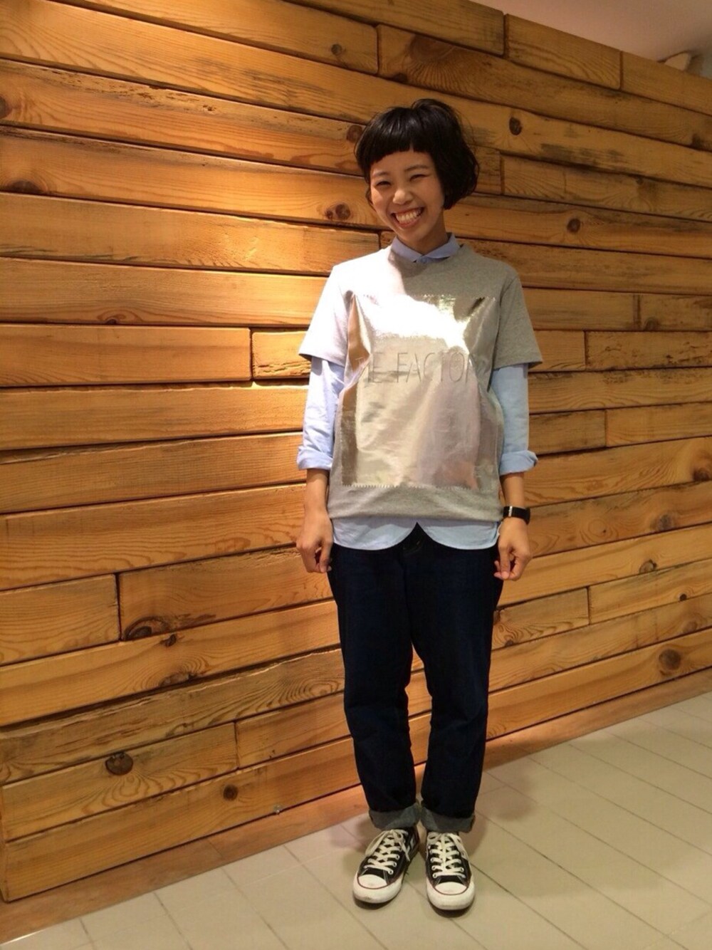 こういう重ね着の時は、ゆったりしていて少し厚みのあるTシャツを選びたい! Tシャツは箔プリントなので、洗濯を繰り返すうちに、プリントがいい感じに落ちてきて、だんだんかっこ良い雰囲気になる予定でありますっ えっへん! デニムみたいな感覚 そういうのなんだか惹かれます
