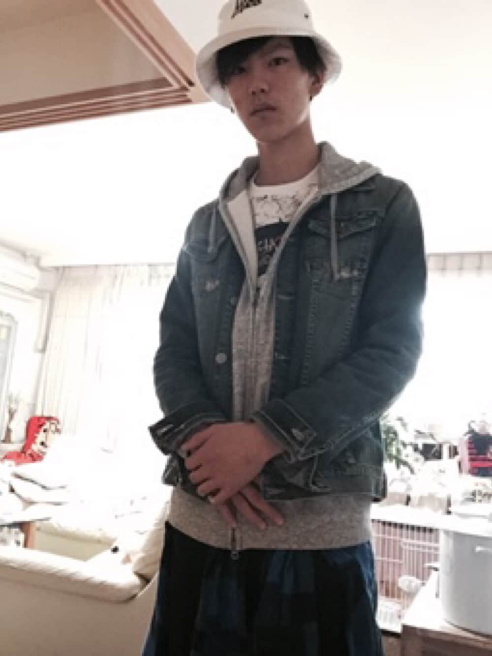 MOBBのバケットハットにジージャン ジージャンの下からフードがでてるとこがお気に入りのポイント