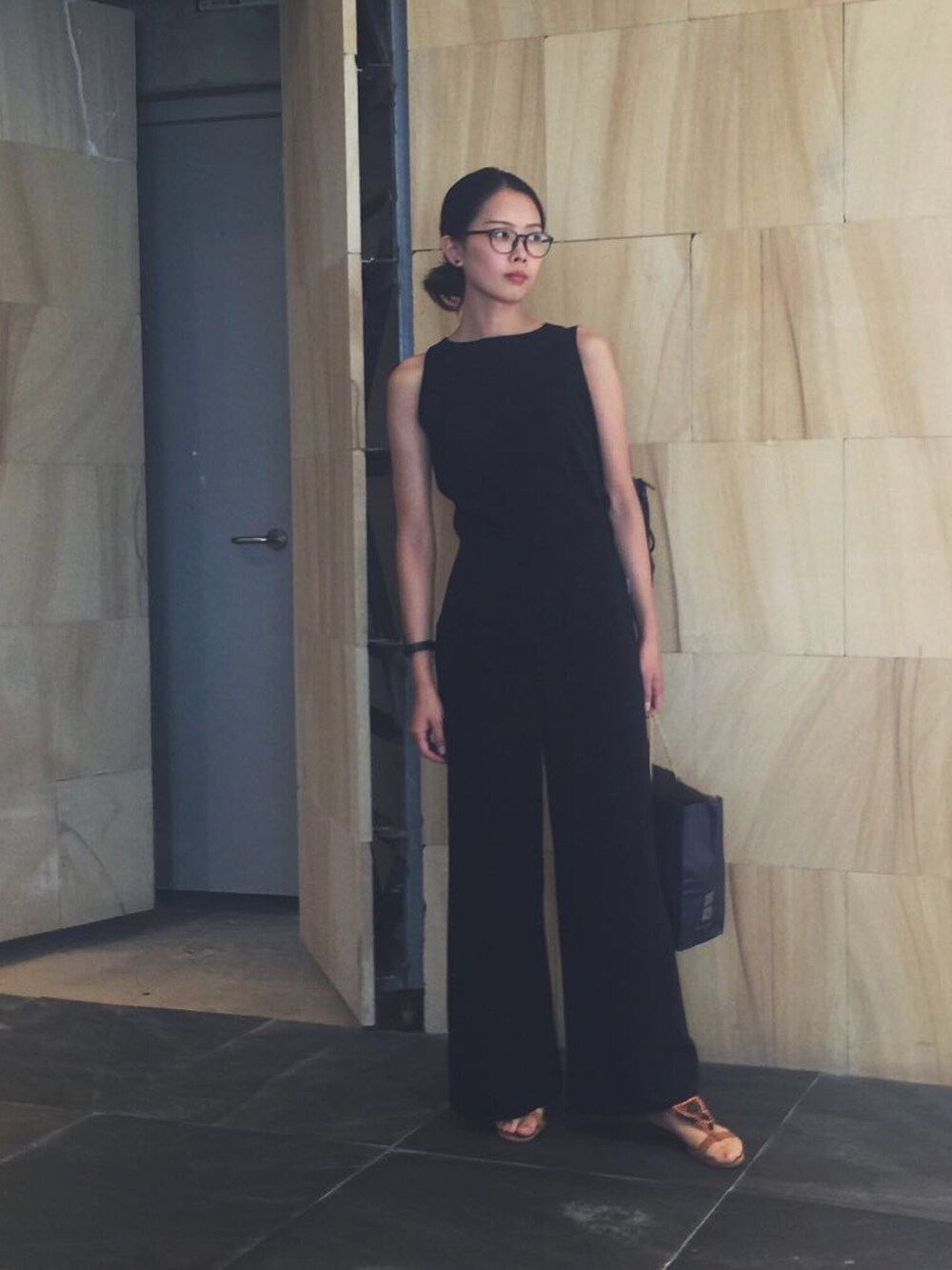 ブラック系のつなぎ/オールインワンを着用したレディースの春コーディネートの1枚目の写真