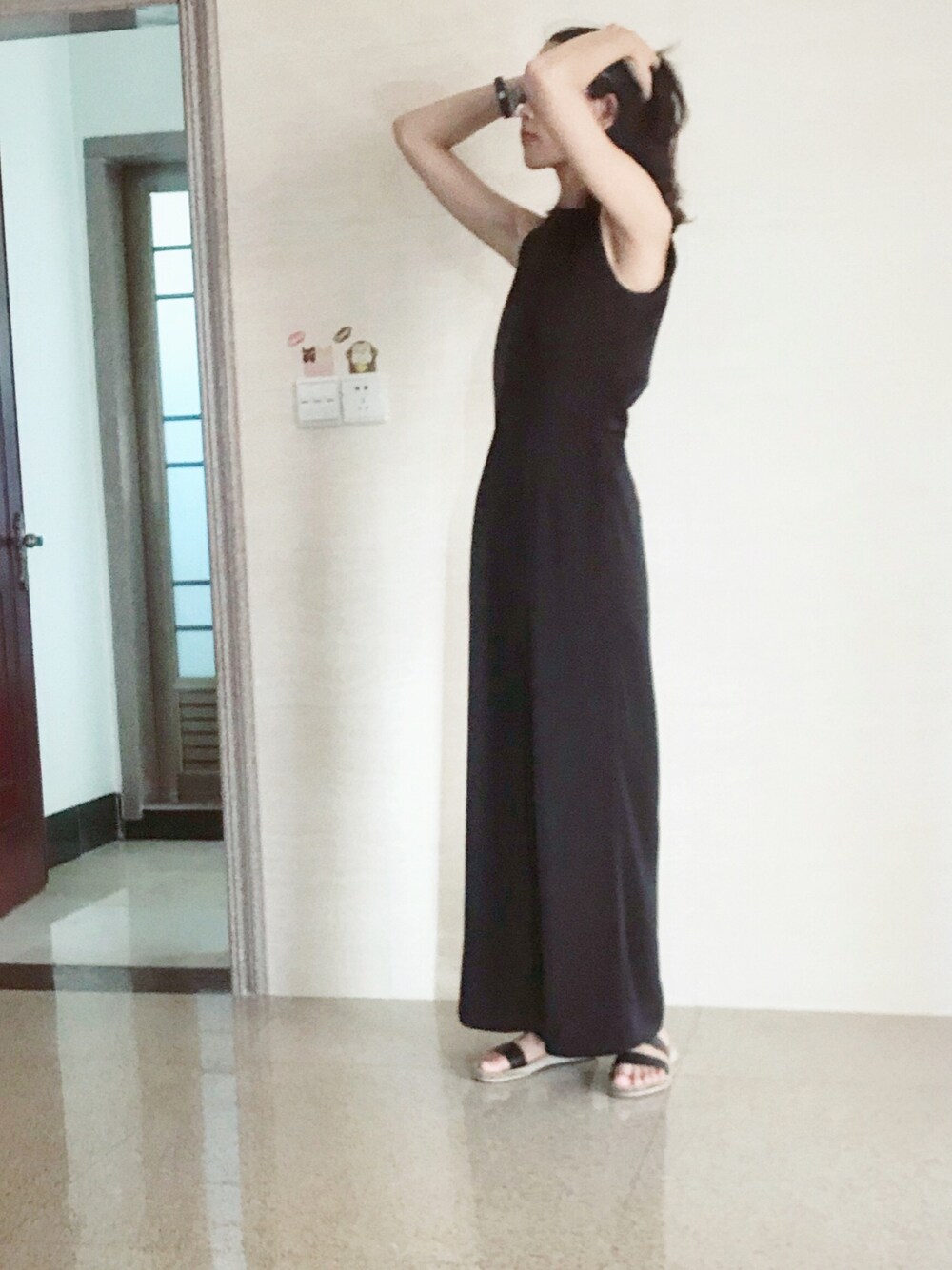 ブラック系のつなぎ/オールインワンを着用したレディースの夏コーディネートの1枚目の写真