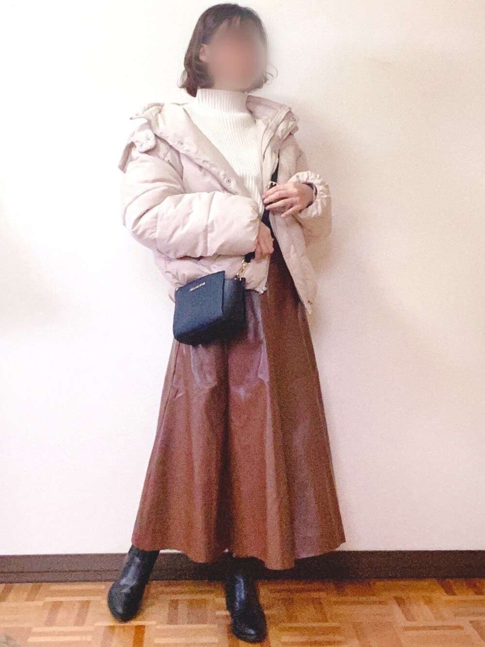 見ていただきありがとうございます😊 いいね、お気に入り、フォローしていただきとっても嬉しいです☺️🌷 白ニットにレザースカート、ダウンパーカーを合わせたキレイめカジュアルコーデです!