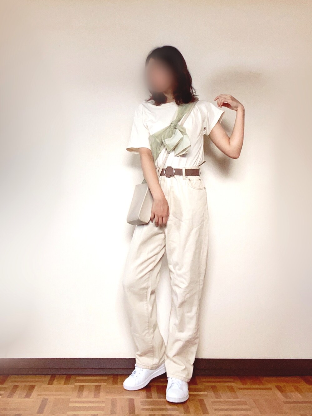 見ていただきありがとうございます😊 いいね、お気に入り、フォローしていただきとっても嬉しいです☺️🌷 ホワイトコーデにアクセントとしてグリーンのシアーシャツをたすき掛けしてみました!