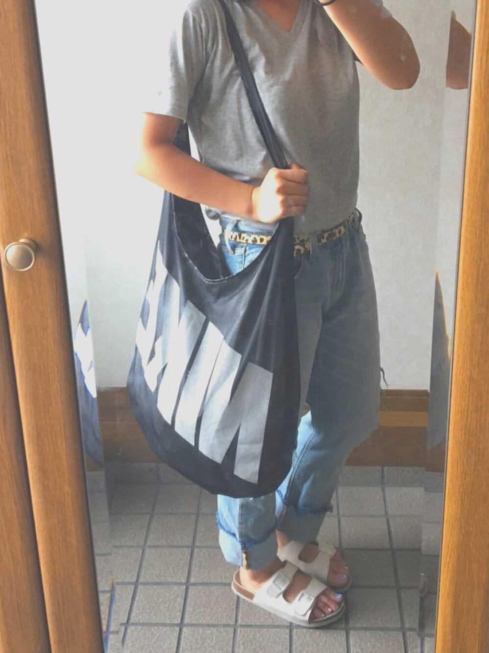 ・ Tシャツ- UNIQLOのメンズのものです👕 デニム - levi'sの501を自分でカットしてダメージとフリンジ風にしてみました✂️ バック - NIKEのものです。リバーシブルなので、裏返すと海でも使える素材になります🏝