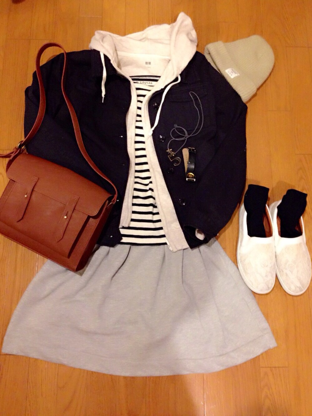 トップス:アウトレット パーカー:UNIQLO ジャケット:prose verse(アウトレット) スカート:PAGE BOY ニット帽:GLOBAL WORK 少し寒い気温の時は中にパーカーを 来てオシャレに🌸