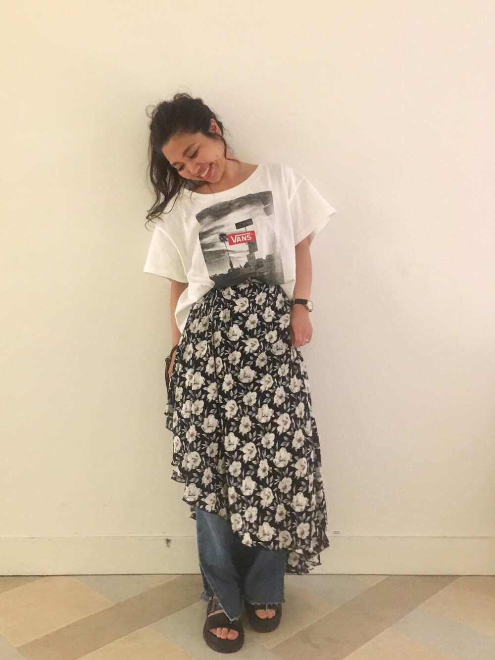 Tシャツ×デニムだけだと、昔のPUFFYみたいになったから、スカートを重ね着😂 TシャツはVANS×Kastane💓