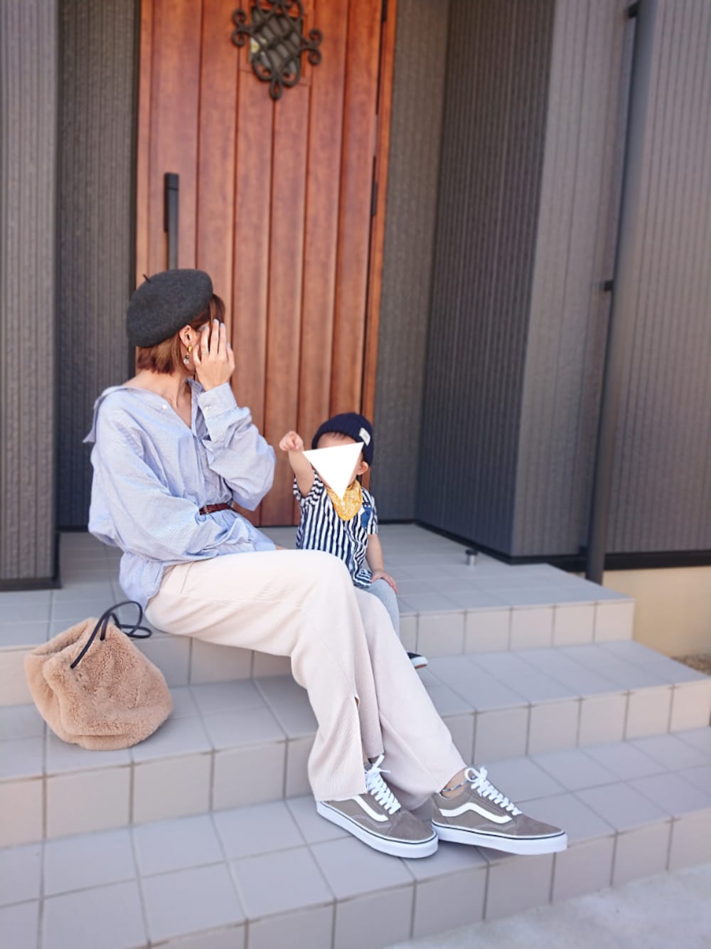 macoさん見てると いつもベレーが欲しくなって やっと理想のカタチを見つけてげっと♡ GUのリブパンツは めぐちゃんと同じホワイトげっとしました♡ ベルトでウエストマークしてたから 私も真似っ子ᐠ(*˙ᵕ˙*)ᐟ ストライプシャツは古着です◎ わかりにくいけど 息子とストライプシャツ×リブパンツで リンクしました☻