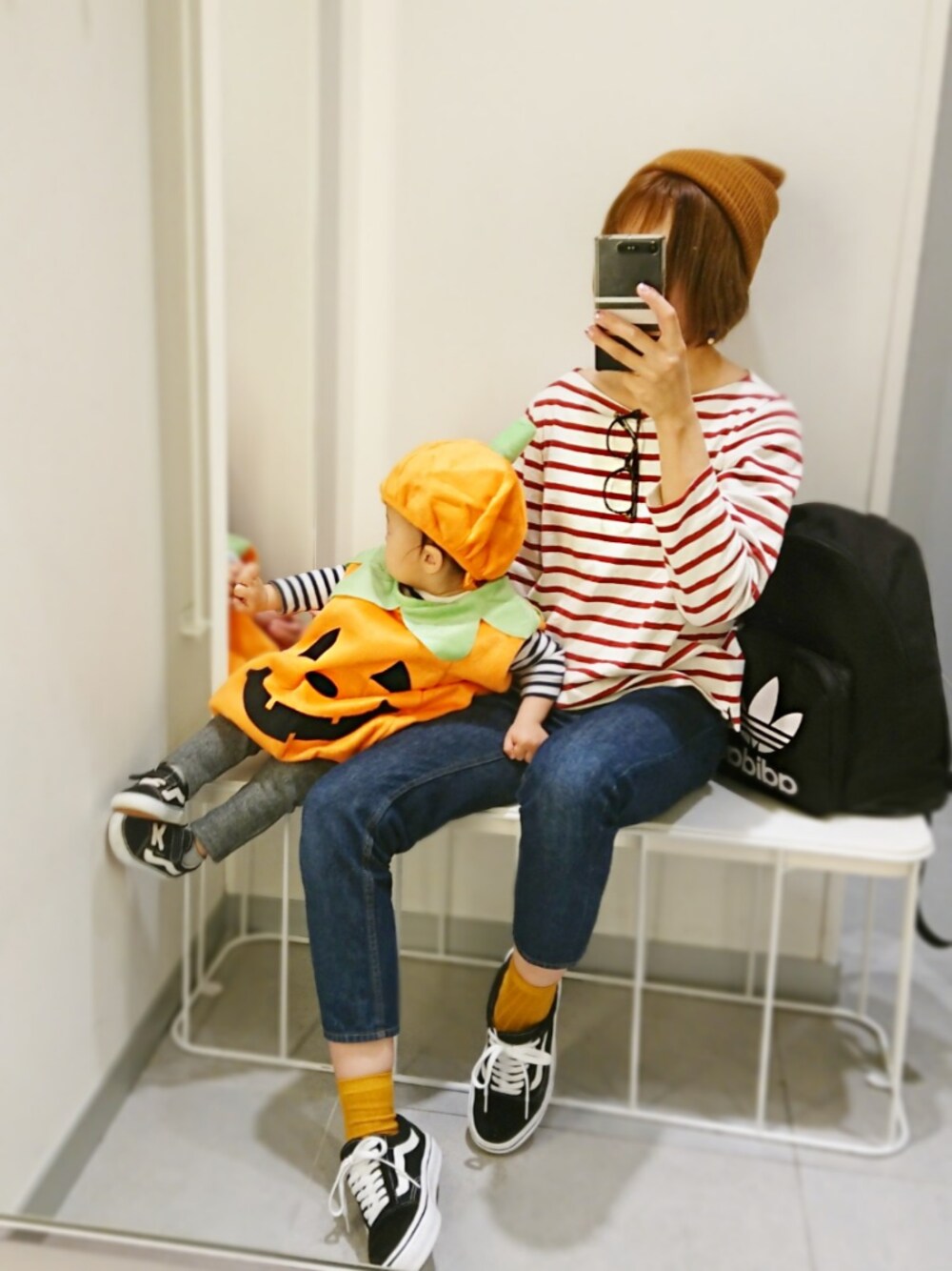 偉そうにくつろぐカボチャと←(笑) ハロパに参加してきました🎃 苦し紛れのウォーリー、、 もうただの盗賊です😂 子どもメインのパーティーだったから それでよし!😂 マスタードソックスはcandoで! マスタードよりのキャメルニット帽は DAISOでみつけた プチプラコーデです♡(笑)