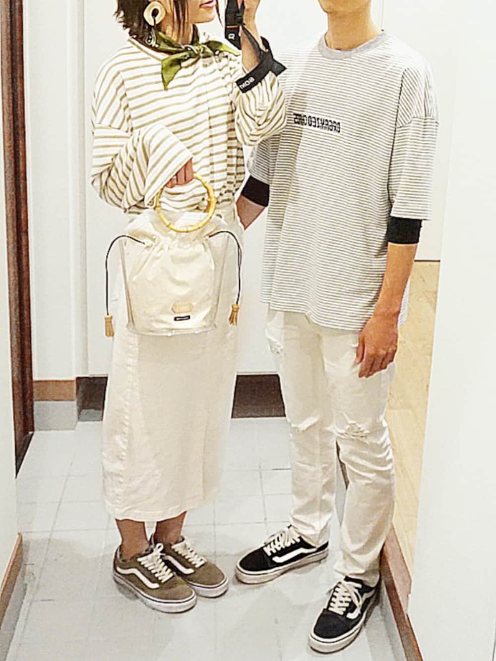 夫婦のコーデ👵🏻🦍 ボーダー×白ボトムスでリンクしました。 バンダナ巻き巻きするの ハマっております。🤭 ご覧いただきありがとうございます✯
