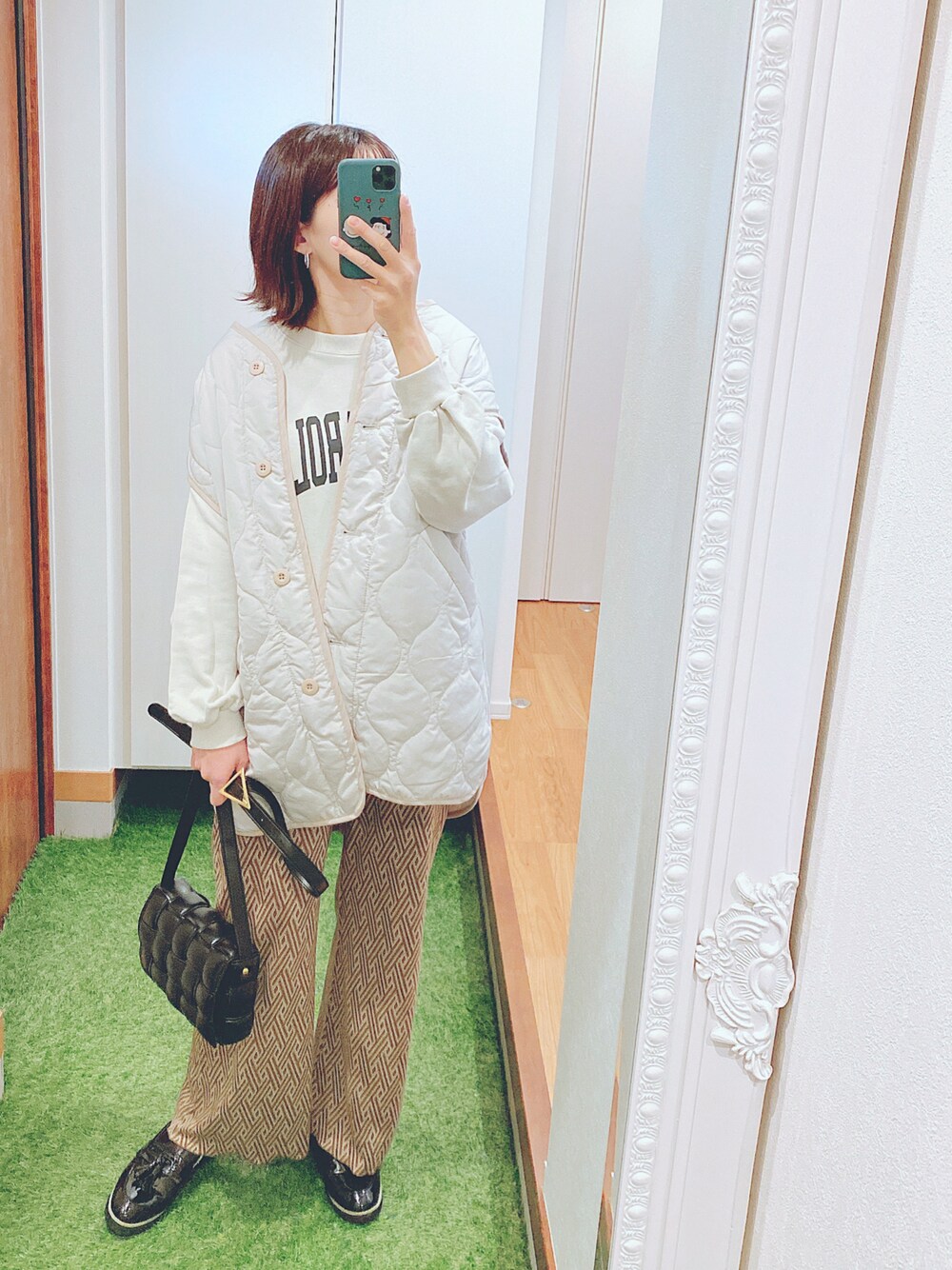 お袖が外せるキルティングジャケット ほんっと買ってよかった。💓 アウター着るまではいかないけど でも肌寒い日、にピッタリ♩ ジャガードパンツはしまむらです。🦓♡ ご覧いただき ありがとうございます✯