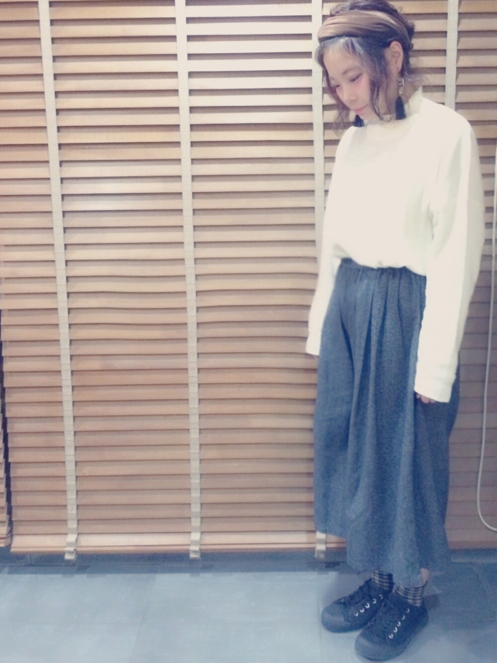 ホワイト系のニット/セーター、グレー系のその他パンツを着用したレディースの冬コーディネートの1枚目の写真