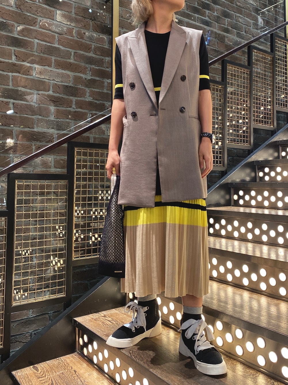 リネンライクのノースリジャケットをレイヤードしました!トレンドのイエローボーダーのワンピースがポイントです。