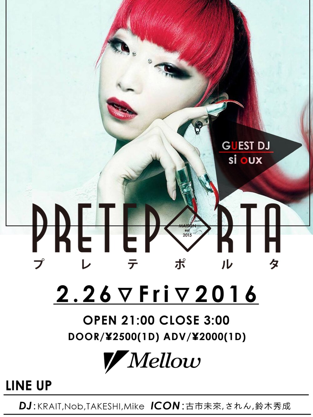 【イベント告知】 ファッション DJパーティ 水戸mellow 2/26 21:00〜 ゲストDJ : si oux ご予約、詳細はコメントにて。 Nightout = オシャレ気取って夜遊びを。 EDMが流行する昨今。各DJがその人気とはまた違うDEEPなトレンドをおさえた確かな最先端のクラブミュージックを発信し、NIGHTOUT(オシャレをして夜遊び)の楽しさや喜びをスナップコーナーやムービーシューティングを利用して最大限に演出します。 ファッションとより密接な関係性を示す為、#茨城スナップ プロジェクトを立ち上げ、ファッションに特化した地域コミュニティを作りあげ、カルチャーの促進とショップスタッフ、美容師などの出会いを促進し、人の繋がりからユーザーに新たなライフスタイルを発見出来る場所にします。 ※当日は写真、動画の撮影が入ります。大変恐れ入りますがパーティーの演出上、ご了承ください。 お気に入りのファッションを汚さない為にフロア内禁煙とさせて頂きます。(別途喫煙スペース有) また、本パーティーにふさわしくない方は入場をご遠慮させて頂く場合もございます。(クロックスやジャージなど) 当日、受付にてSNSで“PRETE PORTAに来た”等を発信して頂いた場合前売り価格にてご入場頂けます。