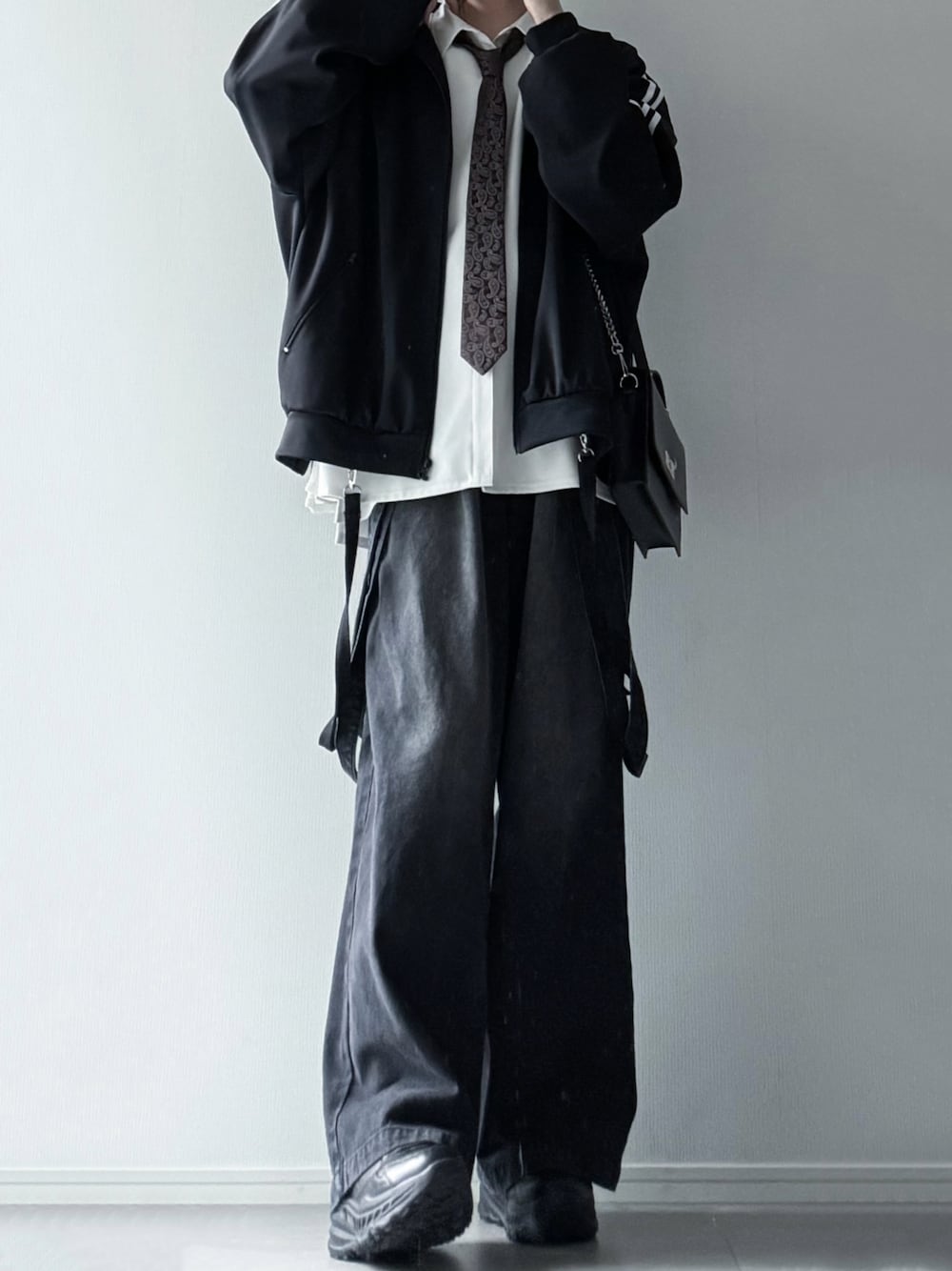 ユウのブルゾン「ルーズシルエットバルーンスリーブフェイクサスペンダードレープトラックジャケット」を使ったコーディネート