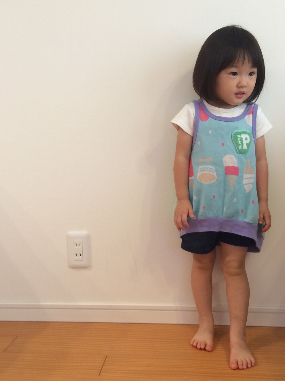 アイスクリーム柄のタンクトップ。 娘は胸のピーマンワッペンがお気に入り。