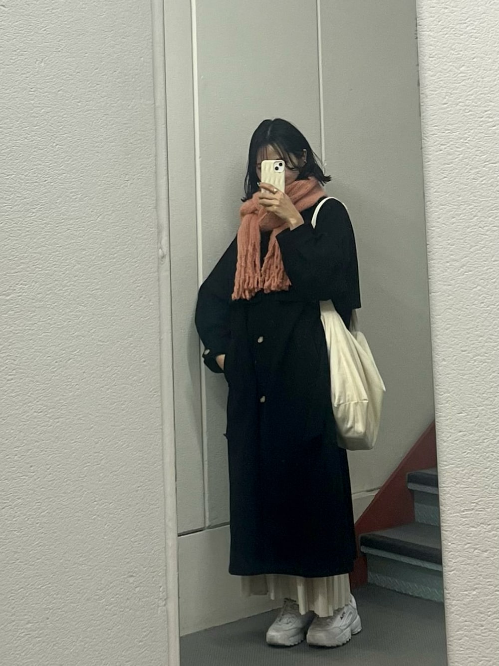 今日の通勤コーデです🤭 黒いコートにピンクのマフラーがアクセントになって可愛い💗 ブーツではなくスニーカーを履くことで、冬感を少なくし春を意識したカジュアルファッションにしてみました~! スカートの形、実はすごく個性的なので今度お見せします!ぜひタグから商品にも飛んでみてください🤲🏻