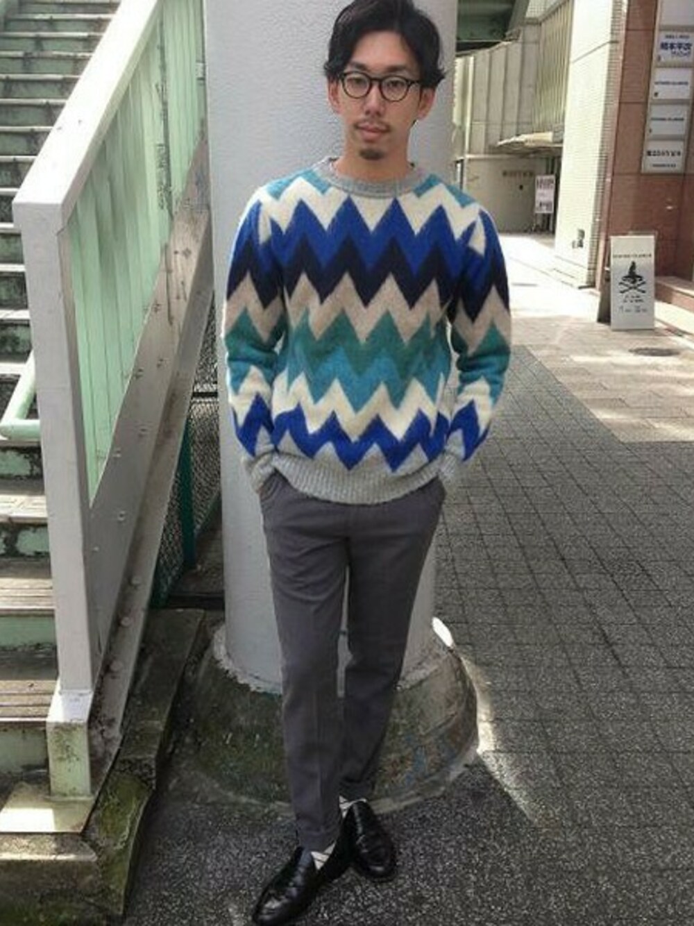 インパクトの強いニットを引き立てるために、グレーのパンツを合わせました。 シャツを着ていないので、足元はローファーでかっちりと。