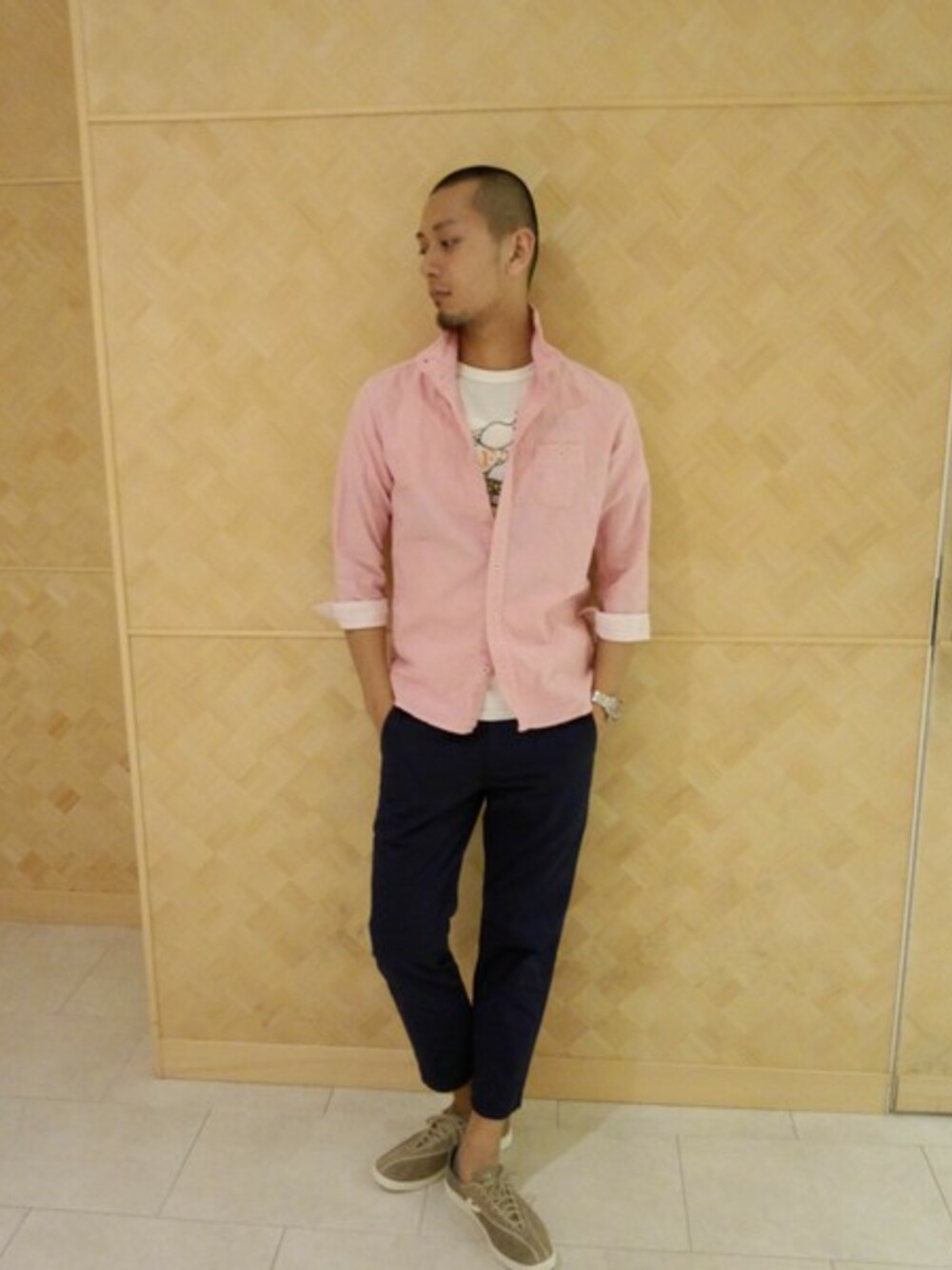 ピンクのスタンドシャツで男らしさと爽やかさを出しました。