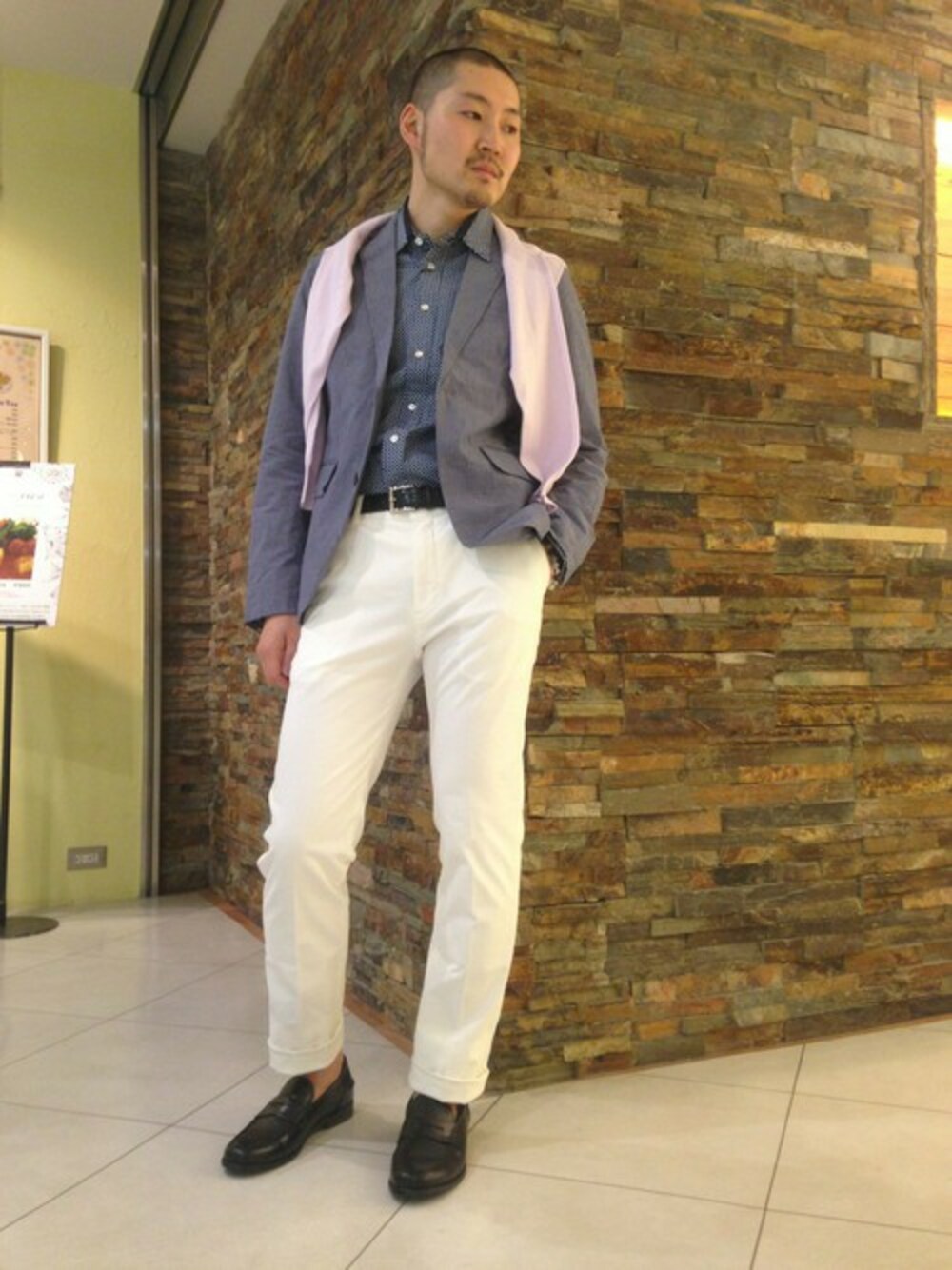 春のジャケパンスタイルです。 肩掛けやローファーで着崩すのがポイントです。