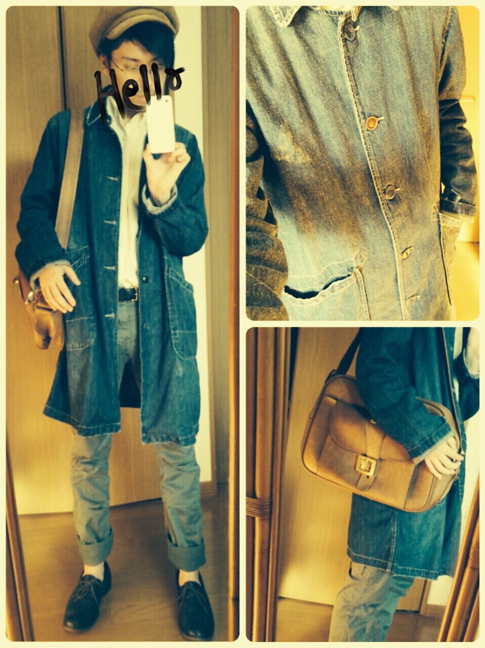 ジャケット、カバンに古着を着用。 シャツ、パンツ、シューズはシンプルに。 帽子と丸メガネでアクセント。