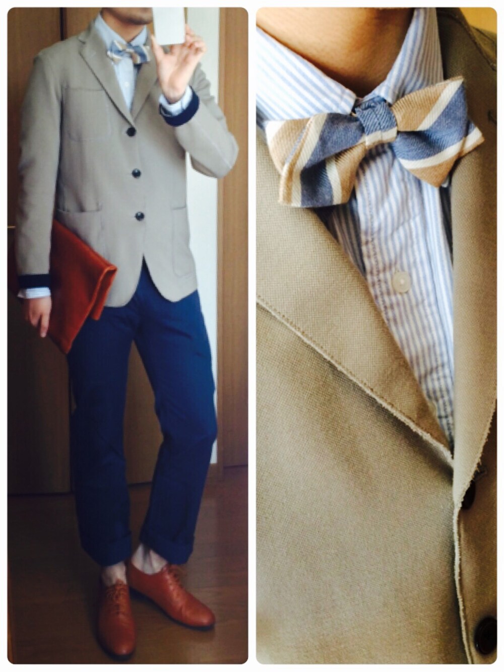 ストライプのシャツにジャケット。 それに合わせて蝶ネクタイで統一感。 バックと靴で色を効かせた大人可愛いコーディネート。