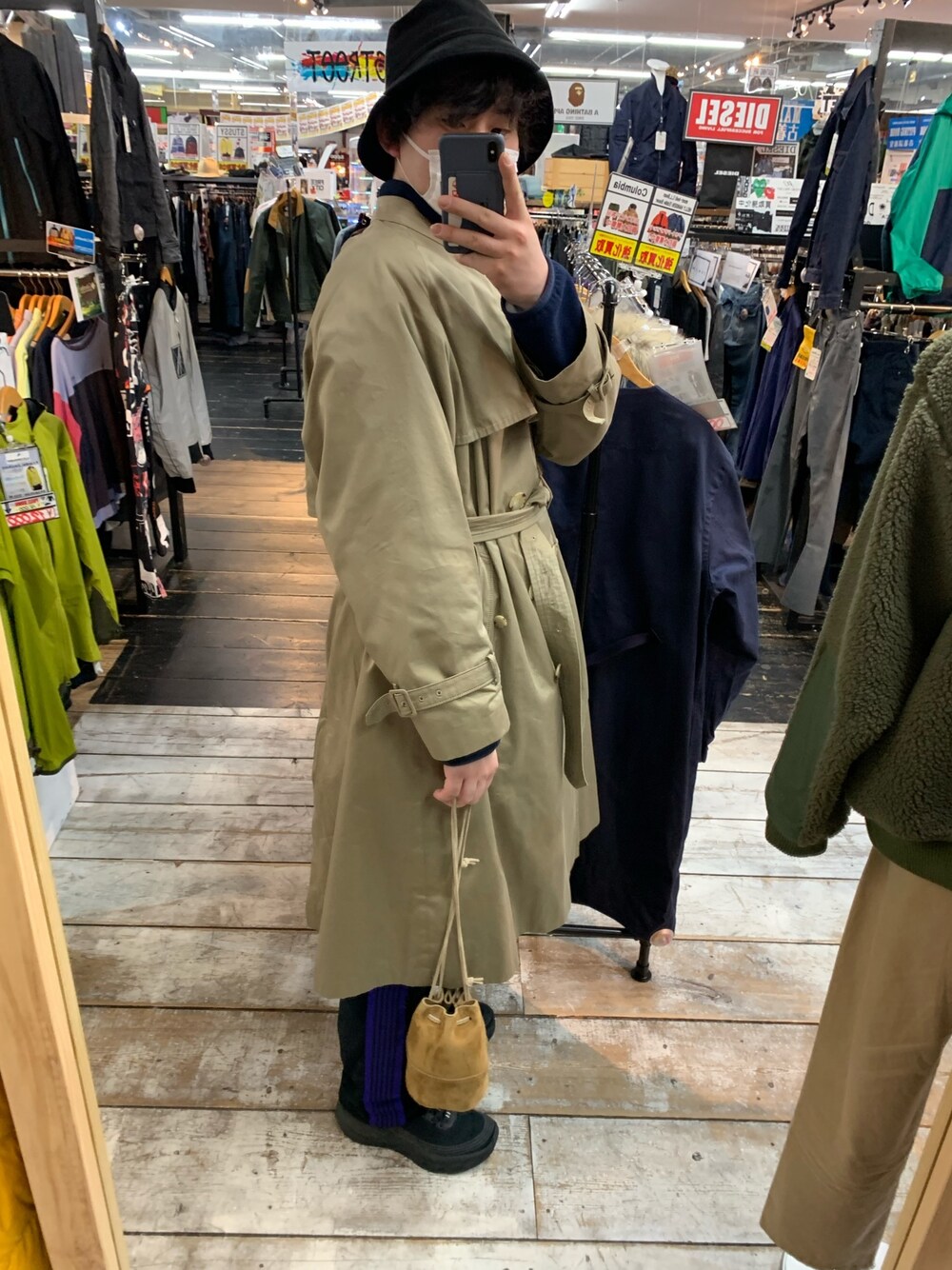 友達と万代に行った時のコーデ トレンチコートはノーカラーです。 中に来てるのはナウティカのハーフジップスウェット古着