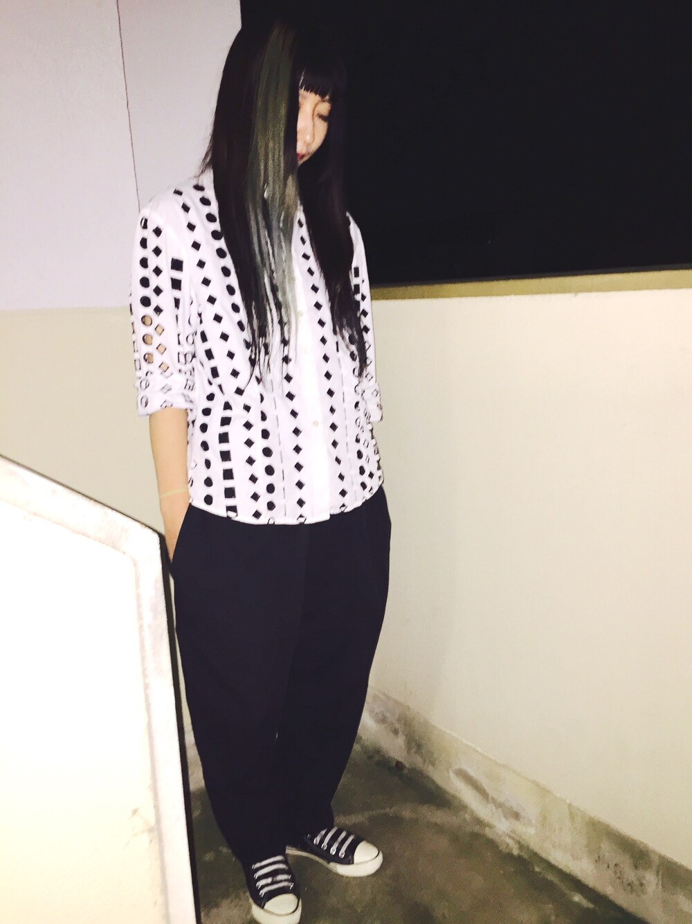 昨日染めたてほやほや♡ 緑と青の中間でくすんでる感じが よくて美容院さんのお姉さんを 困らせました♡笑 このシャツ全部実は穴が空いてて 肌が見え見えですの。
