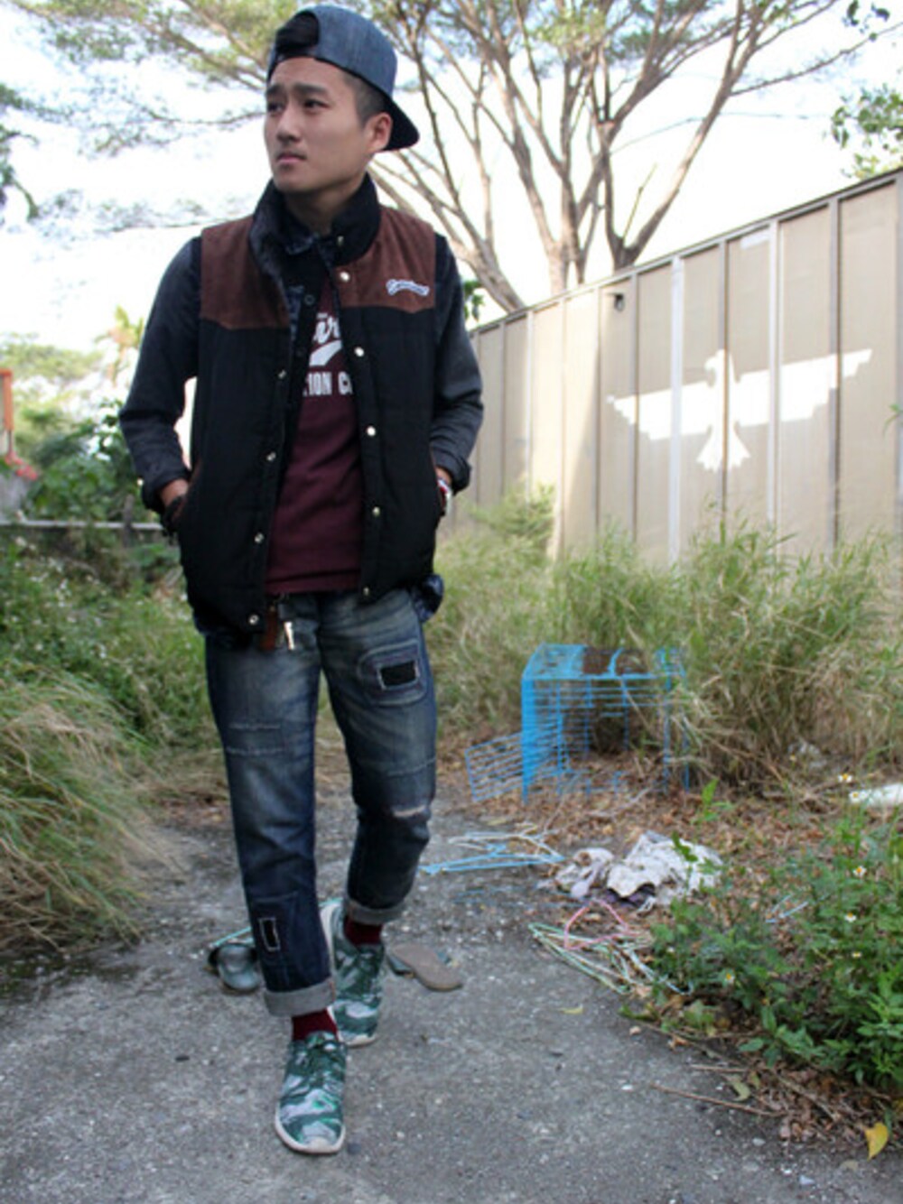 這次想表達的是張力十足的街頭感。 上半身的鋪棉背心,為增添街頭感的重要商品,但也非常著重搭配性,內裡搭配長袖襯衫,利用袖子的材質不同更增填層次感,而下半身選用破壞水洗長褲,增加重點性。