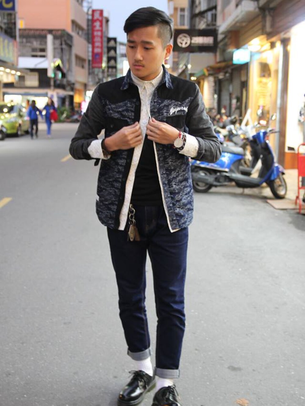 利用白襯衫為內搭,,外搭迷彩黑襯衫,用白襯衫襯托黑襯衫的重點性,而下身搭配白襪襯托上身白襯,整體以襯衫x襯衫,作為重點搭配。